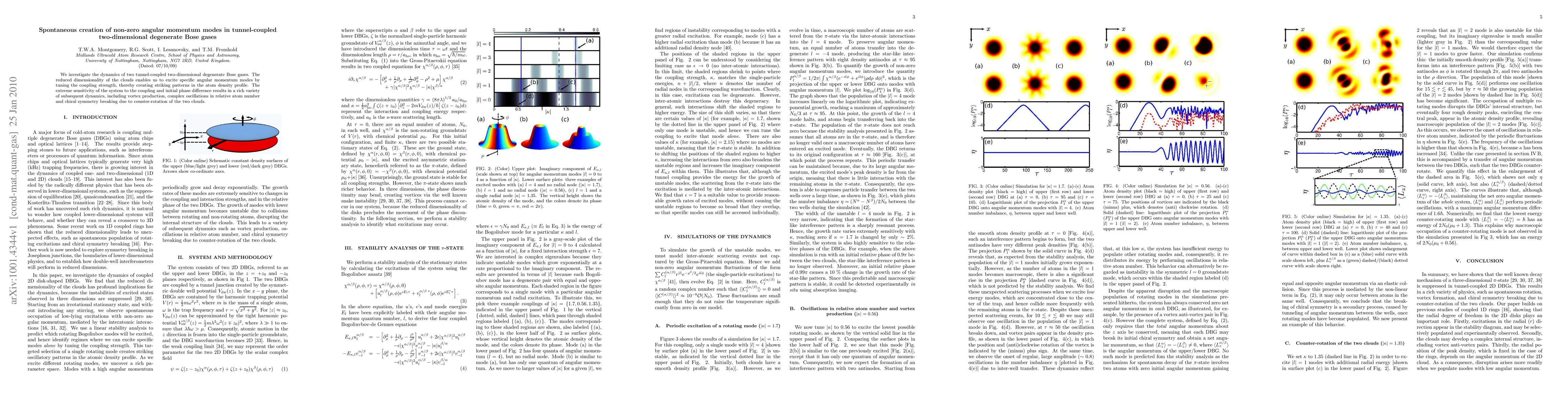 This paper explores the dynamics of tunnel-coupled two-dimensional degenerate Bose gases, revealing the spontaneous creation of non-zero angular momentum modes through tuning coupling strength, leading to a variety of complex phenomena such as vortex formation and chiral symmetry breaking.