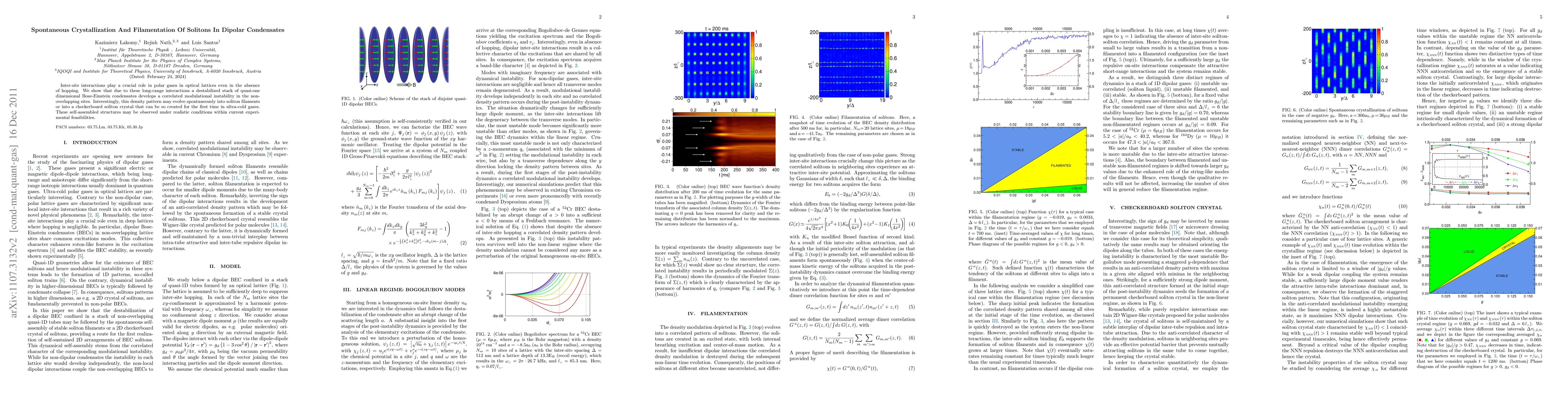 Inter-site interactions play a crucial role in polar gases in optical lattices even in the absence of hopping. We show that due to these long-range interactions a destabilized stack of quasi-one dimensional Bose-Einstein condensates develops a correlated modulational instability in the non-overlapping sites. Interestingly, this density pattern may evolve spontaneously into soliton filaments or a crystal of solitons that can be so created for the first time in ultra-cold gases. These self-assembled structures may be observed under realistic conditions within current experimental feasibilities.