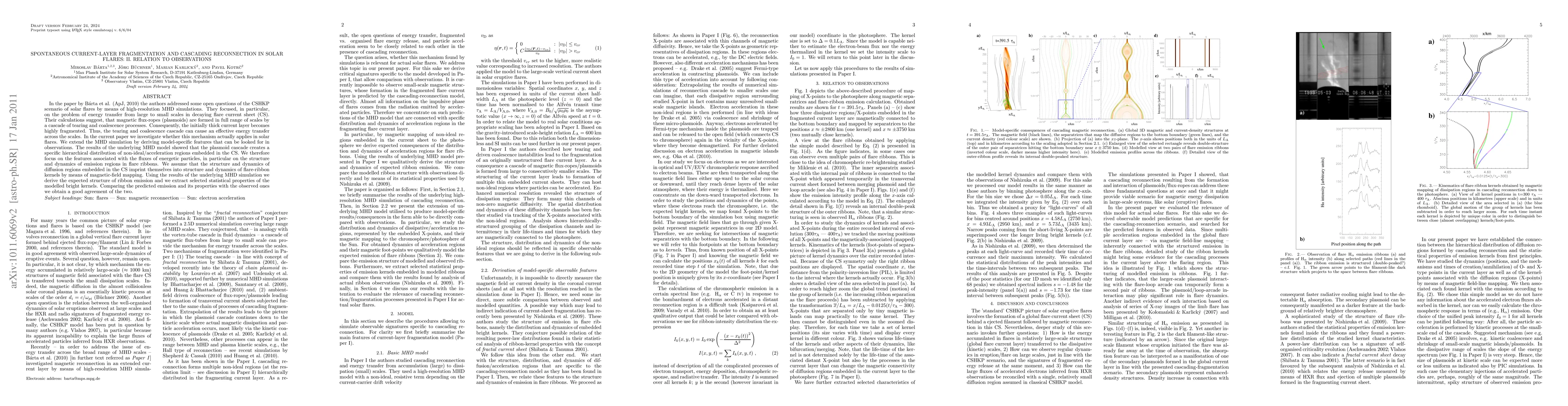 In the paper by B\'arta et al. (arXive:astro-ph:/1011.4035, 2010) the authors addressed some open questions of the CSHKP scenario of solar flares by means of high-resolution MHD simulations. They focused, in particular, on the problem of energy transfer from large to small scales in decaying flare current sheet (CS). Their calculations suggest, that magnetic flux-ropes (plasmoids) are formed in full range of scales by a cascade of tearing and coalescence processes. Consequently, the initially thick current layer becomes highly fragmented. Thus, the tearing and coalescence cascade can cause an effective energy transfer across the scales. In the current paper we investigate whether this mechanism actually applies in solar flares. We extend the MHD simulation by deriving model-specific features that can be looked for in observations. The results of the underlying MHD model showed that the plasmoid cascade creates a specific hierarchical distribution of non-ideal/acceleration regions embedded in the CS. We therefore focus on the features associated with the fluxes of energetic particles, in particular on the structure and dynamics of emission regions in flare ribbons. We assume that the structure and dynamics of diffusion regions embedded in the CS imprint themselves into structure and dynamics of flare-ribbon kernels by means of magnetic-field mapping. Using the results of the underlying MHD simulation we derive the expected structure of ribbon emission and we extract selected statistical properties of the modelled bright kernels. Comparing the predicted emission and its properties with the observed ones we obtain a good agreement of the two.