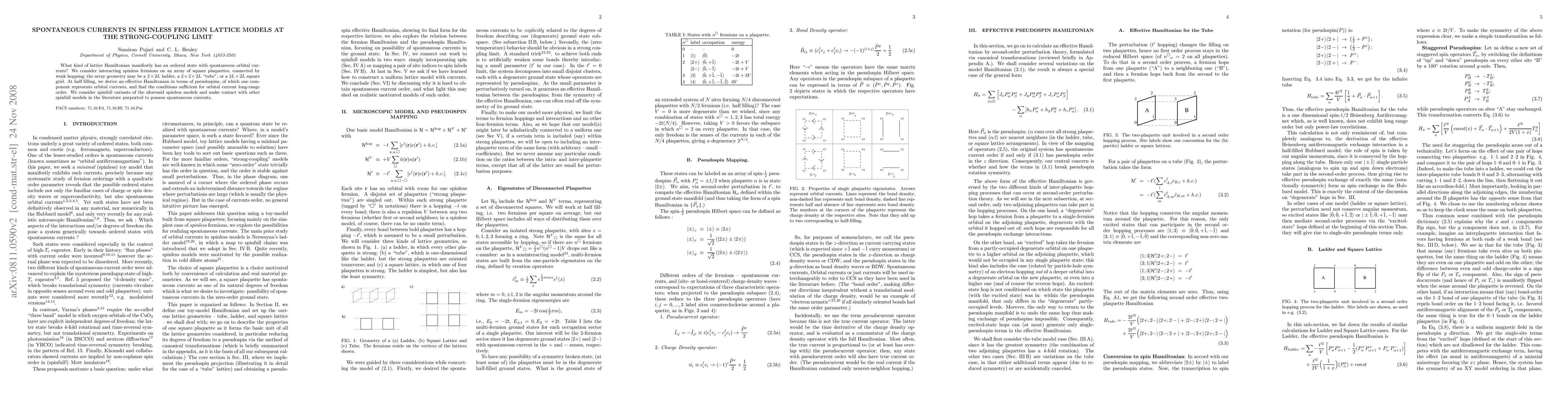 This research investigates spontaneous orbital currents in strongly coupled spinless fermion lattice models. By analyzing square plaquette arrays (ladder, tube, or grid), the study derives an effective Hamiltonian describing currents and establishes conditions for their long-range order at half-filling. It also examines spinful variants and connects findings to other literature models with purported spontaneous currents.