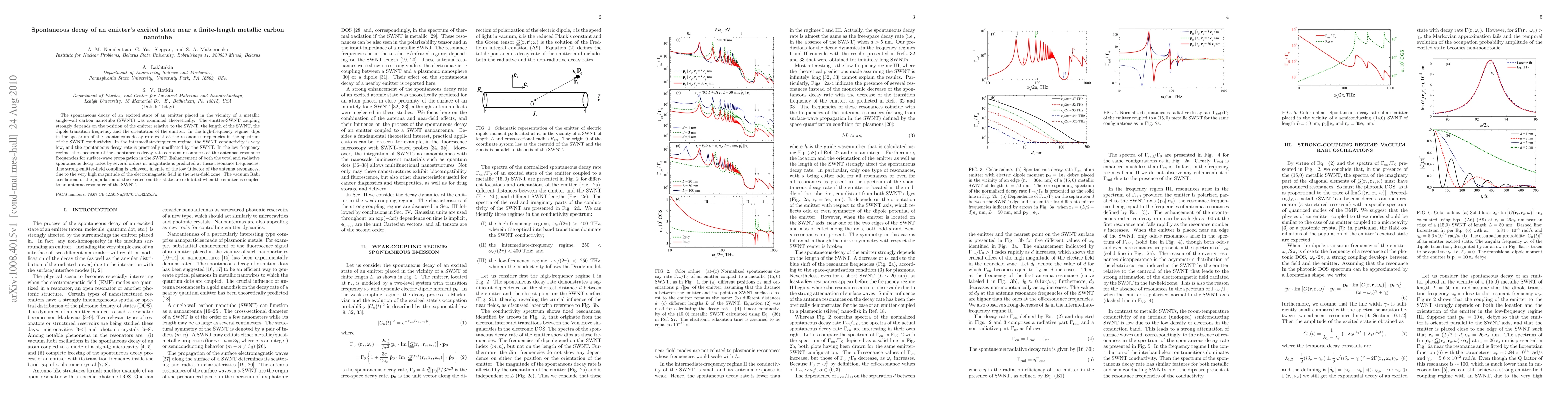 The spontaneous decay of an emitter's excited state near a metallic carbon nanotube is influenced by its position, length, frequency, and orientation, with resonance frequencies exhibiting significant enhancement of decay rates.