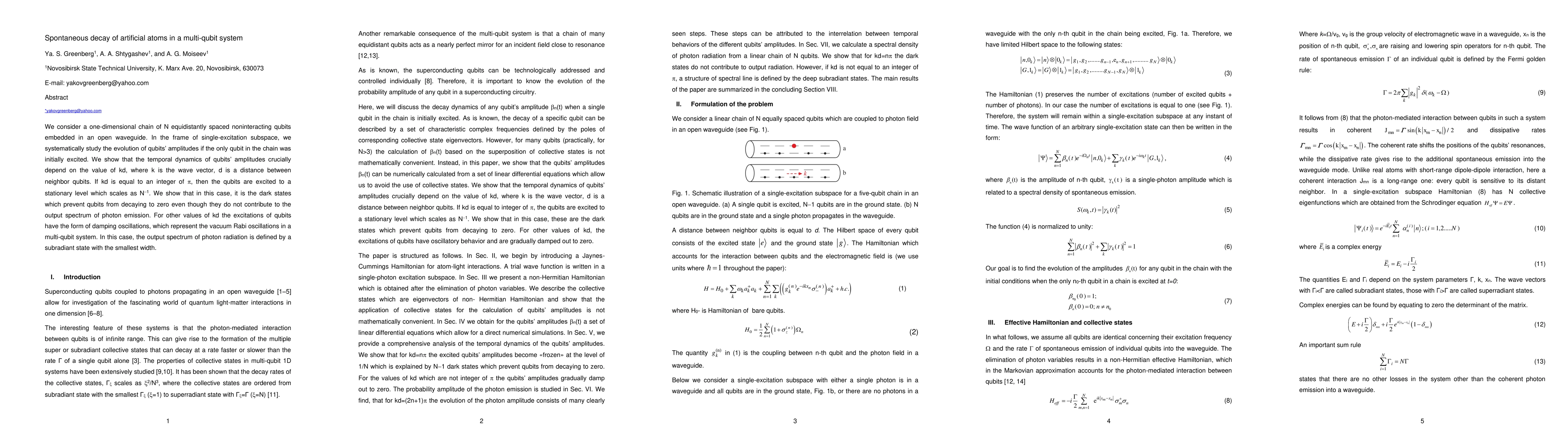 We consider a one-dimensional chain of N equidistantly spaced noninteracting qubits embedded in an open waveguide. In the frame of single-excitation subspace, we systematically study the evolution of qubits amplitudes if the only qubit in the chain was initially excited. We show that the temporal dynamics of qubits amplitudes crucially depend on the value of kd, where k is the wave vector, d is a distance between neighbor qubits. If kd is equal to an integer multiple of $\pi$, then the qubits are excited to a stationary level which scales as SN^{-1}S. We show that in this case, it is the dark states which prevent qubits from decaying to zero even though they do not contribute to the output spectrum of photon emission. For other values of kd the excitations of qubits have the form of damping oscillations, which represent the vacuum Rabi oscillations in a multi-qubit system. In this case, the output spectrum of photon radiation is defined by a subradiant state with the smallest width.