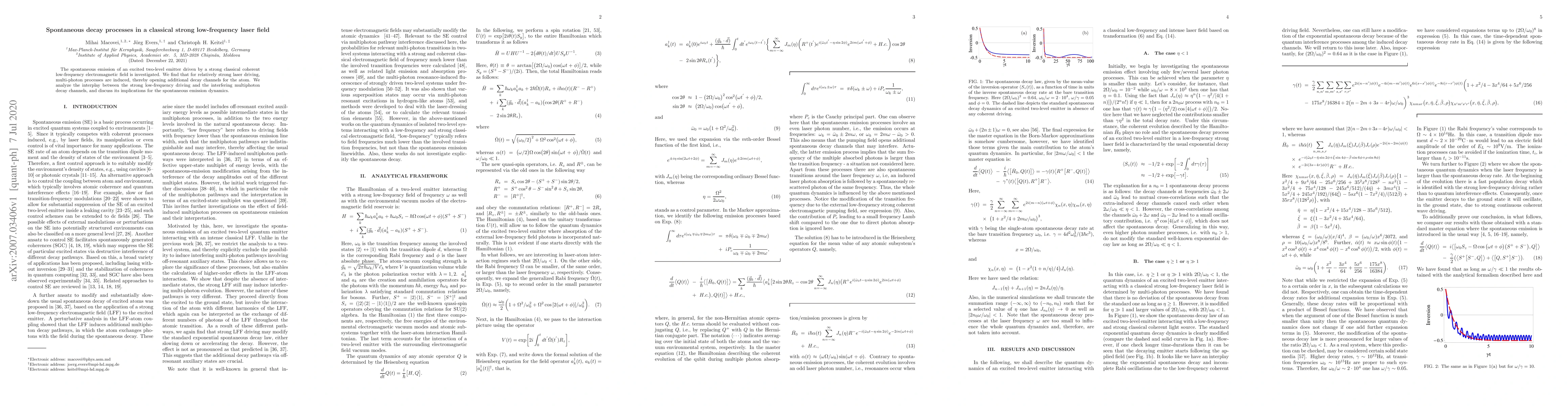 This paper investigates how a strong low-frequency laser field influences the spontaneous emission of an excited two-level emitter, revealing that multi-photon processes create additional decay channels. The study explores the dynamics resulting from the interaction between the driving field and these new decay pathways.