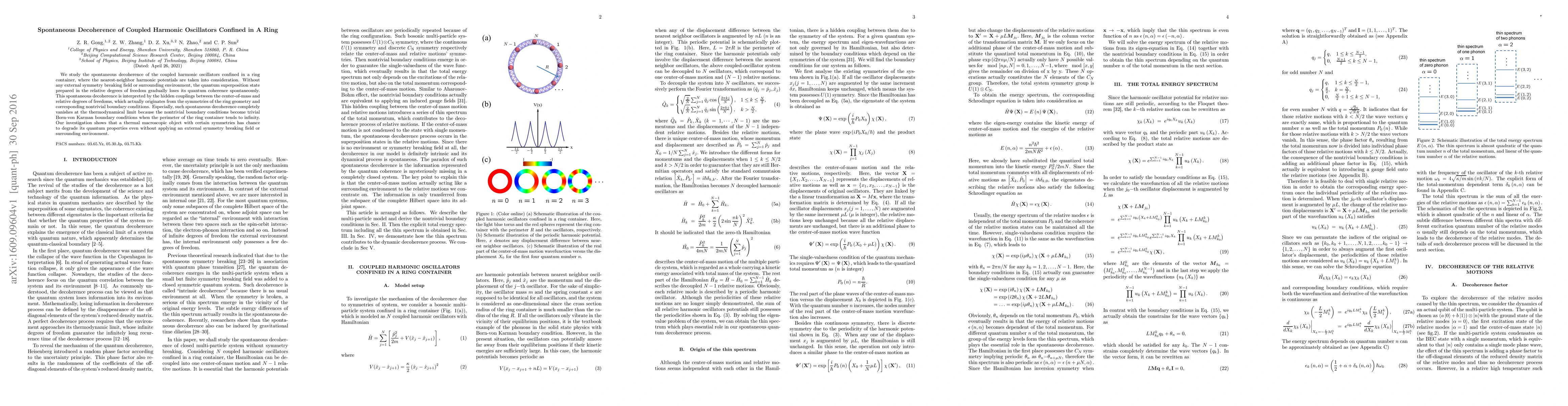 This paper investigates the spontaneous decoherence of coupled harmonic oscillators in a ring, revealing that quantum coherence diminishes due to hidden couplings between center-of-mass and relative degrees of freedom, driven by the ring's geometry and boundary conditions. The phenomenon vanishes in the thermodynamic limit as boundary conditions become trivial.
