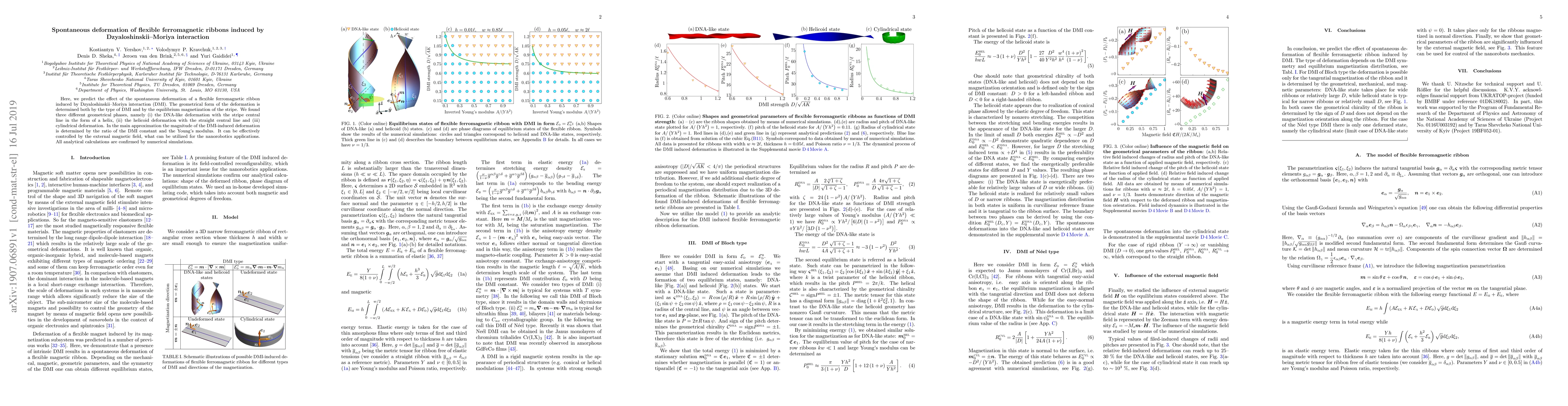This paper predicts the spontaneous deformation of flexible ferromagnetic ribbons driven by Dzyaloshinskii-Moriya interaction, identifying three geometrical phases: DNA-like, helicoid, and cylindrical. The deformation magnitude is controlled by the DMI constant and Young's modulus, with potential applications in nanorobotics.