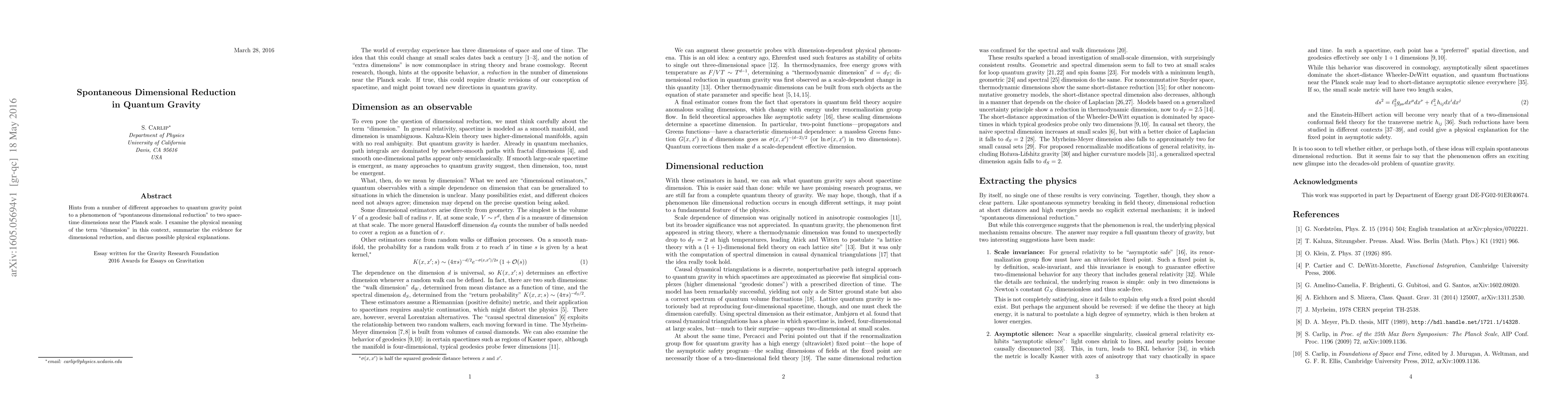 This paper explores the concept of "spontaneous dimensional reduction" in quantum gravity, suggesting that spacetime may reduce to two dimensions near the Planck scale. It investigates the implications and evidence for this phenomenon, along with theoretical explanations for its occurrence.