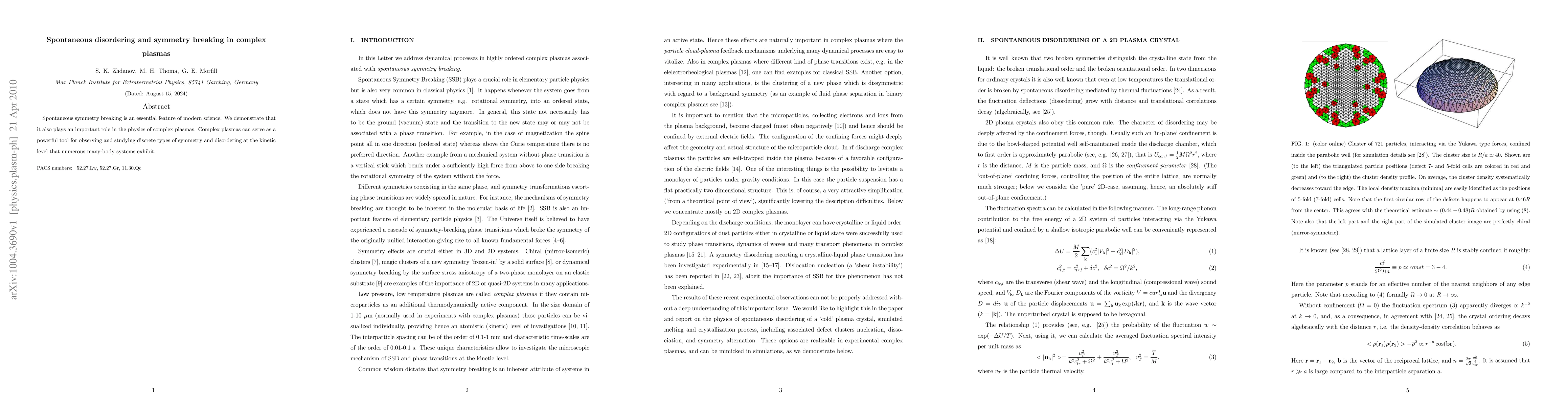 Spontaneous symmetry breaking is an essential feature of modern science. We demonstrate that it also plays an important role in the physics of complex plasmas. Complex plasmas can serve as a powerful tool for observing and studying discrete types of symmetry and disordering at the kinetic level that numerous many-body systems exhibit.