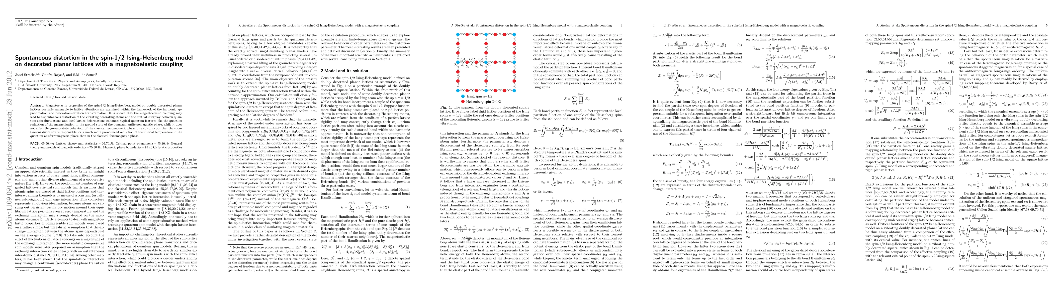 This paper investigates the magnetoelastic properties of a spin-1/2 Ising-Heisenberg model on doubly decorated planar lattices, revealing that quantum spin fluctuations and lattice spacing fluctuations significantly reduce magnetization in the quantum antiferromagnetic phase but do not affect the classical ferromagnetic phase. The local lattice fluctuations also lead to a more pronounced reduction in critical temperature for the quantum antiferromagnetic phase.