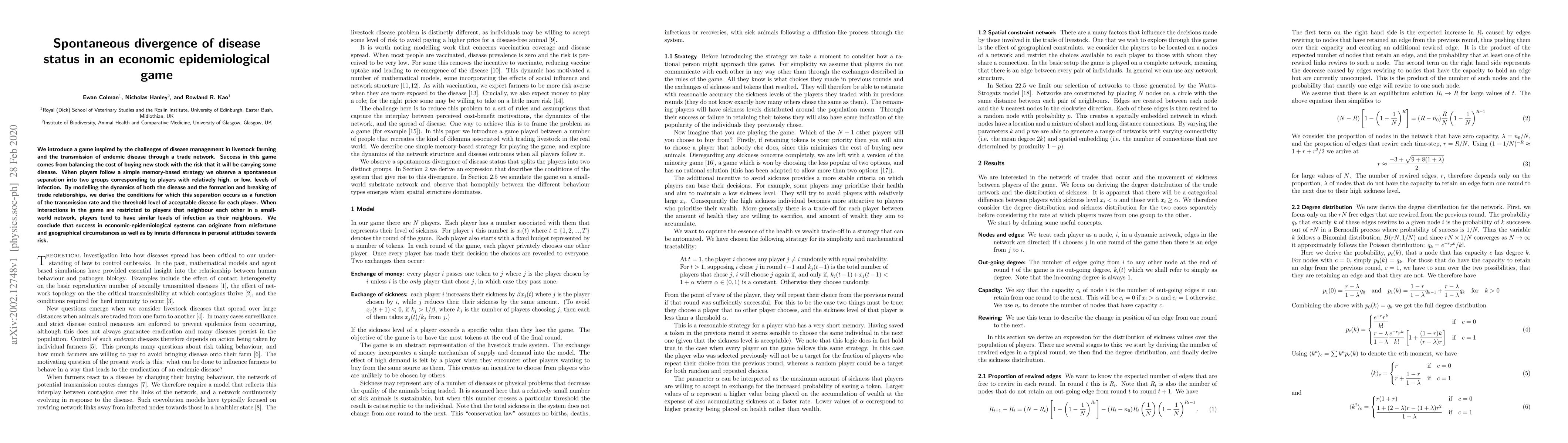 We introduce a game inspired by the challenges of disease management in livestock farming and the transmission of endemic disease through a trade network. Success in this game comes from balancing the cost of buying new stock with the risk that it will be carrying some disease. When players follow a simple memory-based strategy we observe a spontaneous separation into two groups corresponding to players with relatively high, or low, levels of infection. By modelling the dynamics of both the disease and the formation and breaking of trade relationships, we derive the conditions for which this separation occurs as a function of the transmission rate and the threshold level of acceptable disease for each player. When interactions in the game are restricted to players that neighbour each other in a small-world network, players tend to have similar levels of infection as their neighbours. We conclude that success in economic-epidemiological systems can originate from misfortune and geographical circumstances as well as by innate differences in personal attitudes towards risk.