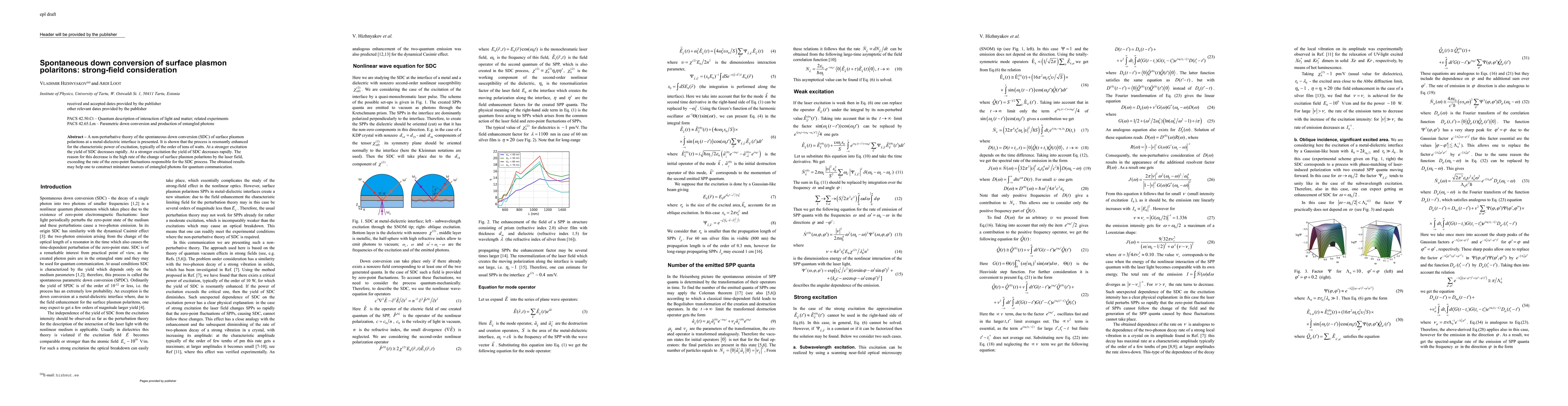 This paper presents a non-perturbative theory for the spontaneous down conversion of surface plasmon polaritons at metal-dielectric interfaces, showing that the process is resonantly enhanced at tens of watts of excitation. However, at higher excitation levels, the yield decreases due to the laser field altering the surface plasmons faster than zero-point fluctuations, potentially aiding in the development of miniature entangled photon sources for quantum communication.