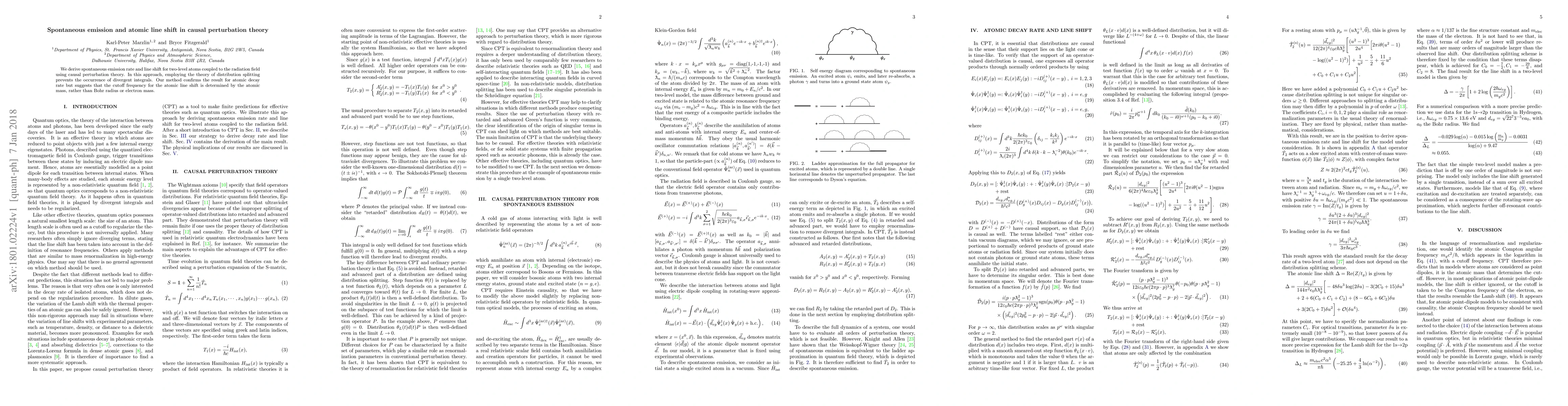 This paper presents a novel method using causal perturbation theory to calculate spontaneous emission rate and atomic line shift for two-level atoms interacting with radiation. The approach avoids divergent integrals through distribution splitting, confirming the atomic decay rate result while suggesting that the atomic mass, not Bohr or electron mass, sets the cutoff frequency for atomic line shift.