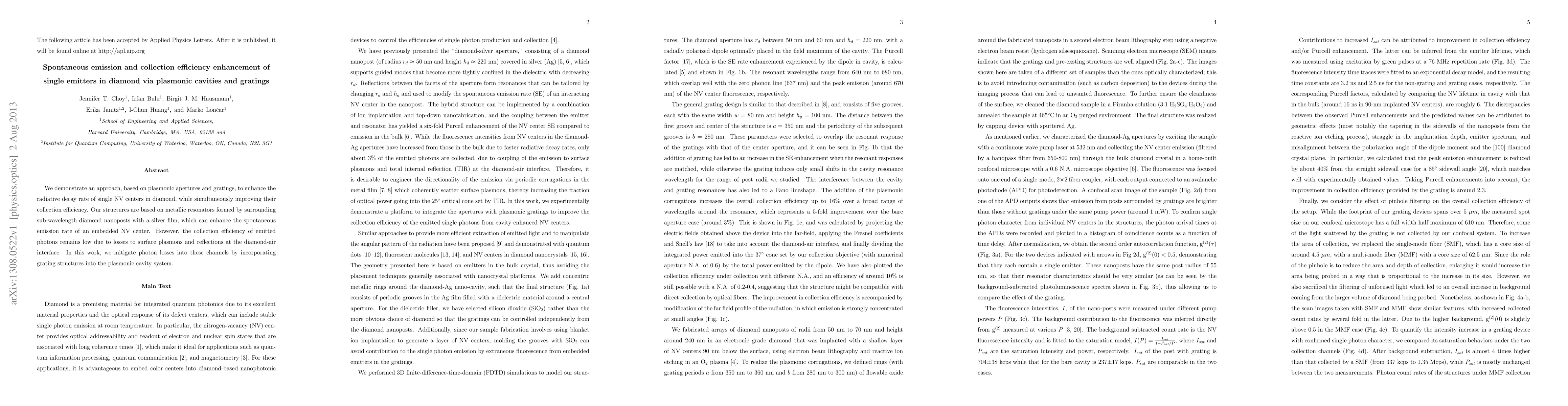 This paper demonstrates a method to boost the radiative decay rate and collection efficiency of single NV centers in diamond using plasmonic apertures and gratings. By integrating metallic resonators and grating structures, it enhances spontaneous emission while mitigating photon losses to surface plasmons and reflections.
