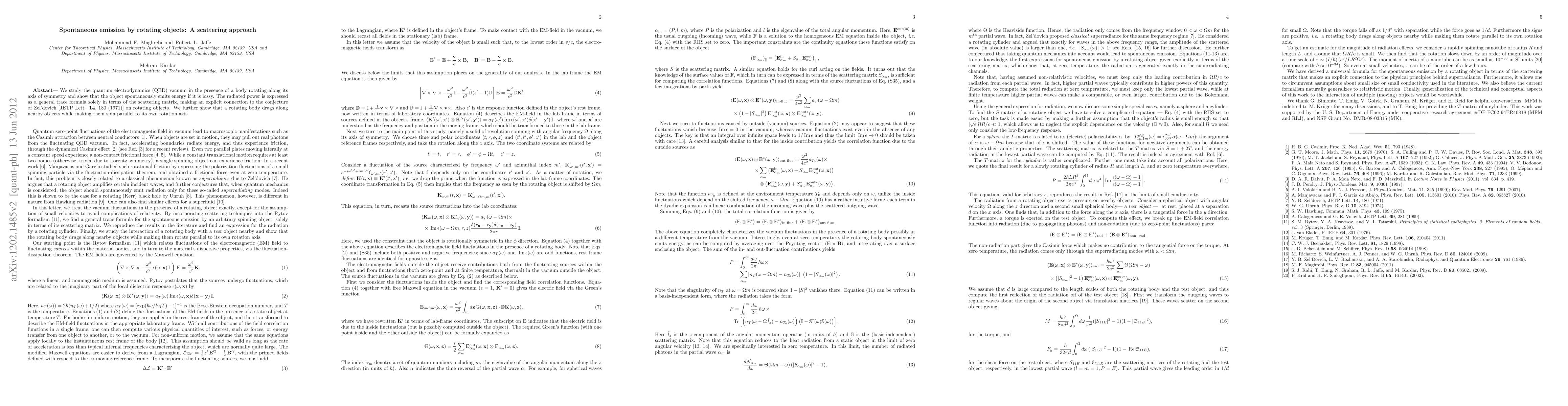 We study the quantum electrodynamics (QED) vacuum in the presence of a body rotating along its axis of symmetry and show that the object spontaneously emits energy if it is lossy. The radiated power is expressed as a general trace formula solely in terms of the scattering matrix, making an explicit connection to the conjecture of Zel'dovich [JETP Lett. 14, 180 (1971)] on rotating objects. We further show that a rotating body drags along nearby objects while making them spin parallel to its own rotation axis.