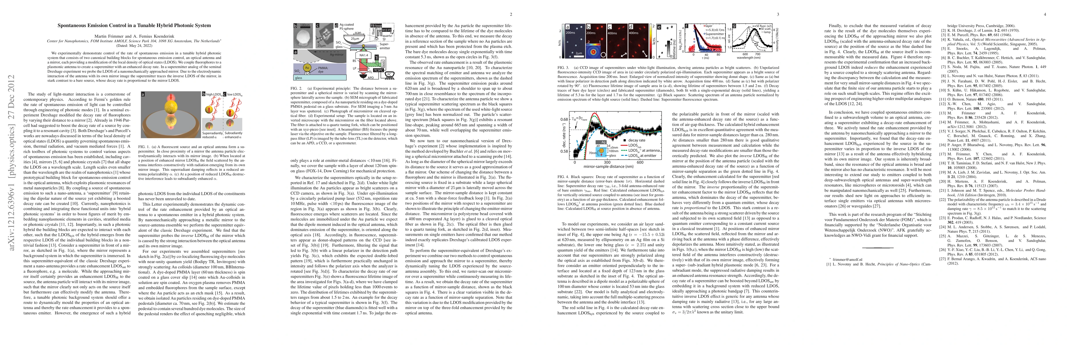This paper demonstrates control over the rate of spontaneous emission in a hybrid photonic system using an optical antenna and a mirror to modify the local density of optical states. The system creates a superemitter with enhanced decay rate, showing that the emission rate inversely traces the mirror's local density of optical states, unlike a bare source.