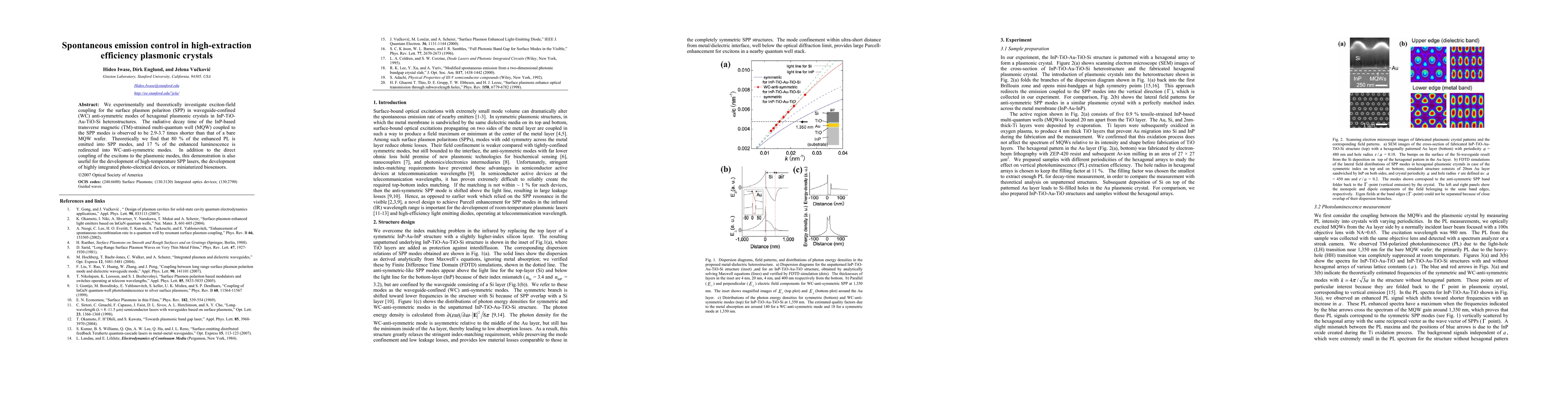 This paper investigates exciton-field coupling in plasmonic crystals, showing that the radiative decay time of InP-based TM-strained MQWs is significantly reduced when coupled with SPP modes. The study finds 80% of enhanced PL emitted into SPP modes, with 17% redirected into waveguide-confined anti-symmetric modes, highlighting potential applications in SPP lasers, photo-electrical devices, and biosensors.