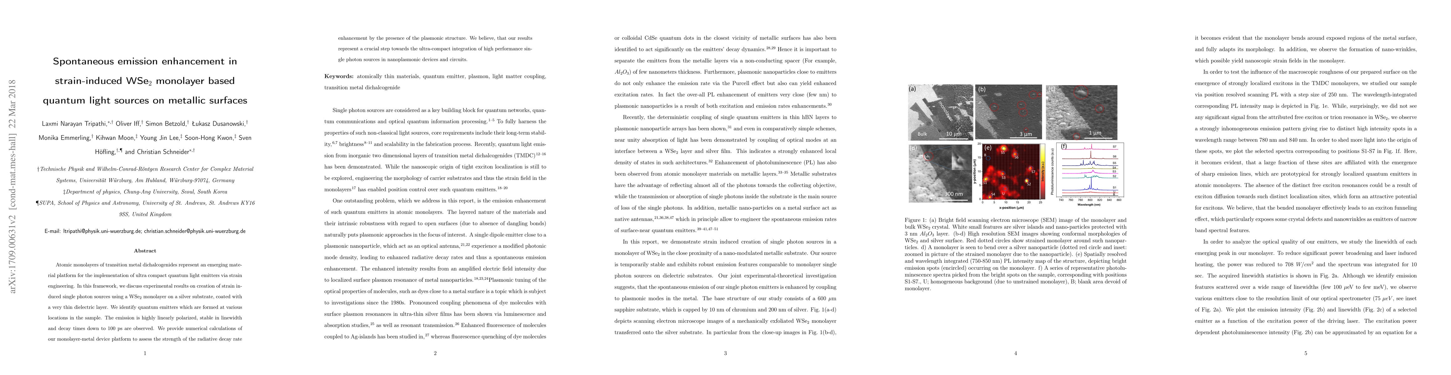 Atomic monolayers of transition metal dichalcogenides represent an emerging material platform for the implementation of ultra compact quantum light emitters via strain engineering. In this framework, we discuss experimental results on creation of strain induced single photon sources using a WSe2 monolayer on a silver substrate, coated with a very thin dielectric layer. We identify quantum emitters which are formed at various locations in the sample. The emission is highly linearly polarized, stable in linewidth and decay times down to 300 ps are observed. We provide numerical calculations of our monolayer-metal device platform to assess the strength of the radiative decay rate enhancement by the presence of the plasmonic structure. We believe, that our results represent a crucial step towards the ultra-compact integration of high performance single photon sources in nanoplasmonic devices and circuits.