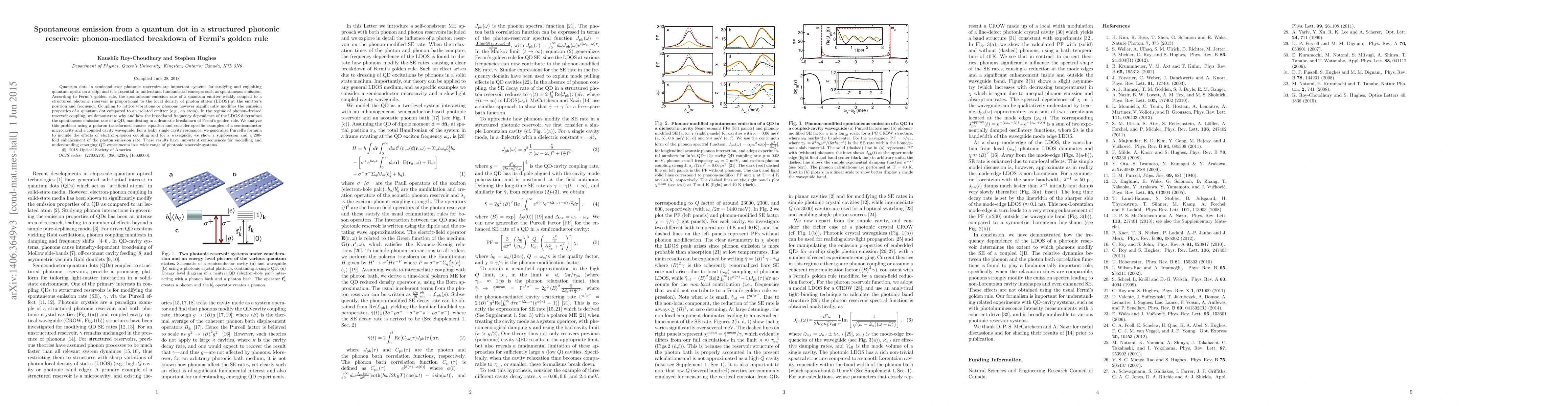 This paper investigates how a structured photonic medium, such as a photonic crystal cavity or a coupled cavity waveguide, influences the spontaneous emission rate from an excited quantum dot via electron-phonon coupling. The study reveals that phonons can lead to a breakdown of Fermi's golden rule due to the broadband frequency dependence of the local photon density of states, resulting in both suppression and enhancement of the photon emission rate.