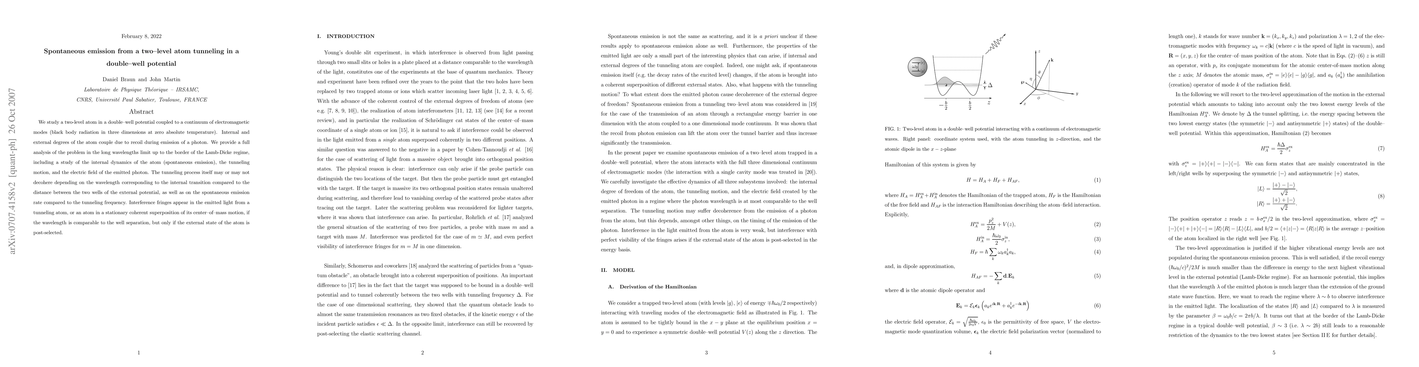 We study a two-level atom in a double--well potential coupled to a continuum of electromagnetic modes (black body radiation in three dimensions at zero absolute temperature). Internal and external degrees of the atom couple due to recoil during emission of a photon. We provide a full analysis of the problem in the long wavelengths limit up to the border of the Lamb-Dicke regime, including a study of the internal dynamics of the atom (spontaneous emission), the tunneling motion, and the electric field of the emitted photon. The tunneling process itself may or may not decohere depending on the wavelength corresponding to the internal transition compared to the distance between the two wells of the external potential, as well as on the spontaneous emission rate compared to the tunneling frequency. Interference fringes appear in the emitted light from a tunneling atom, or an atom in a stationary coherent superposition of its center--of--mass motion, if the wavelength is comparable to the well separation, but only if the external state of the atom is post-selected.