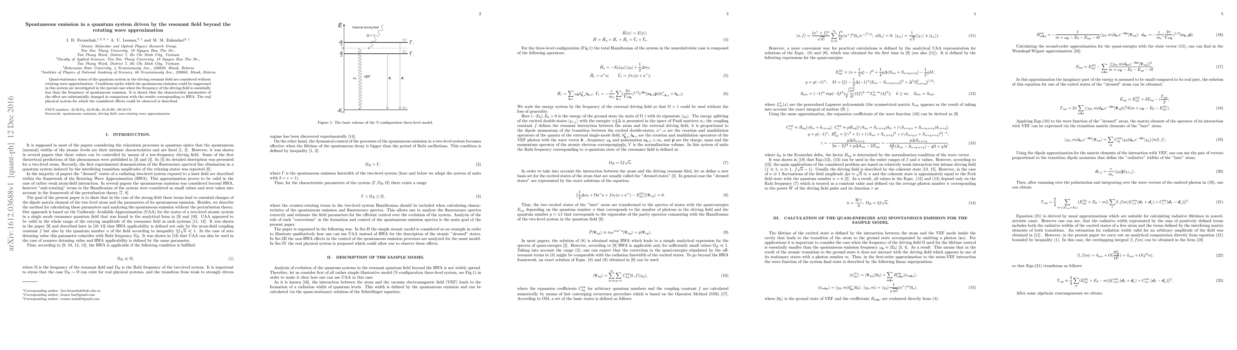 This paper investigates quasi-stationary states in a quantum system driven by a resonant field beyond the rotating wave approximation, finding conditions under which spontaneous emission can be suppressed when the driving field's frequency is much lower than the spontaneous emission frequency. The study reveals significant changes in characteristic parameters compared to results obtained using the rotating wave approximation.