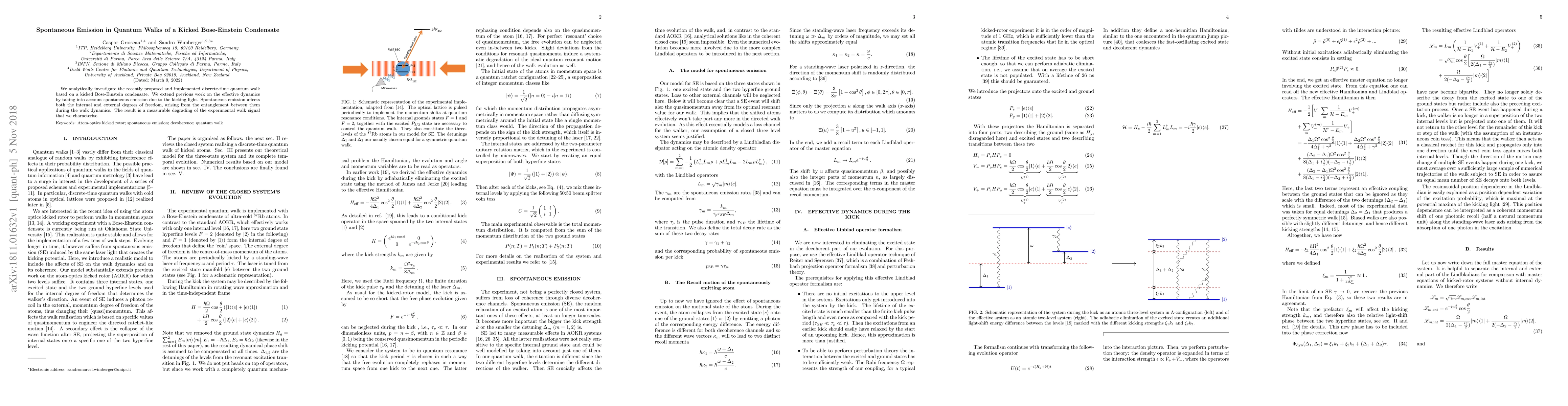 We analytically investigate the recently proposed and implemented discrete-time quantum walk based on a kicked Bose-Einstein condensate. We extend previous work on the effective dynamics by taking into account spontaneous emission due to the kicking light. Spontaneous emission affects both the internal and external degrees of freedom, arising from the entanglement between them during the walk dynamics. The result is a measurable degrading of the experimental walk signal that we characterise.