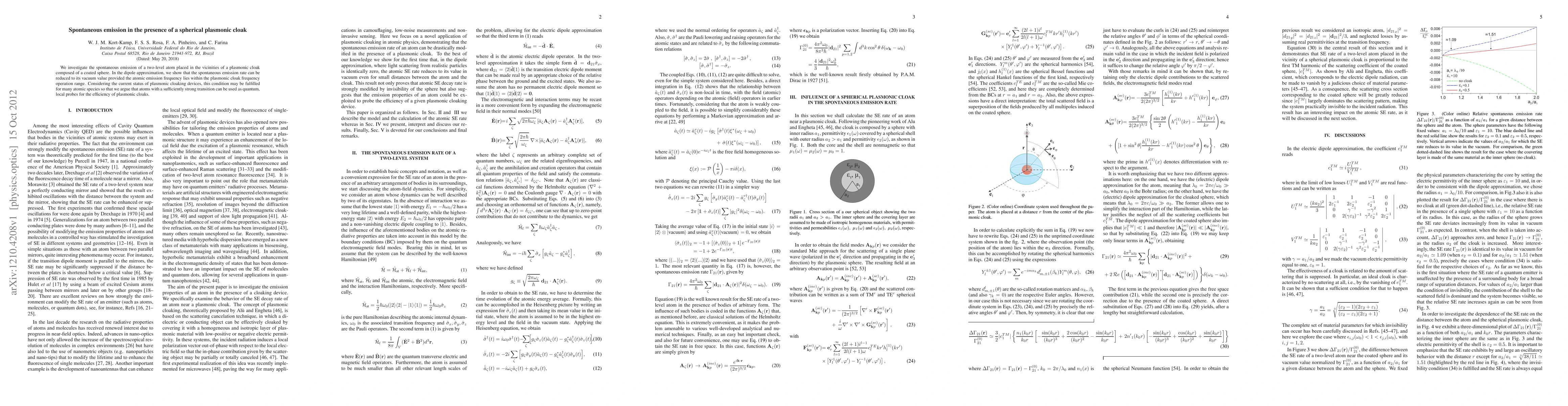 This paper explores how a plasmonic cloak can reduce the spontaneous emission rate of a two-level atom to its vacuum value when the atom's emission frequency aligns with the cloak's operational range. It suggests that such atoms could serve as quantum probes for assessing the effectiveness of plasmonic cloaks.
