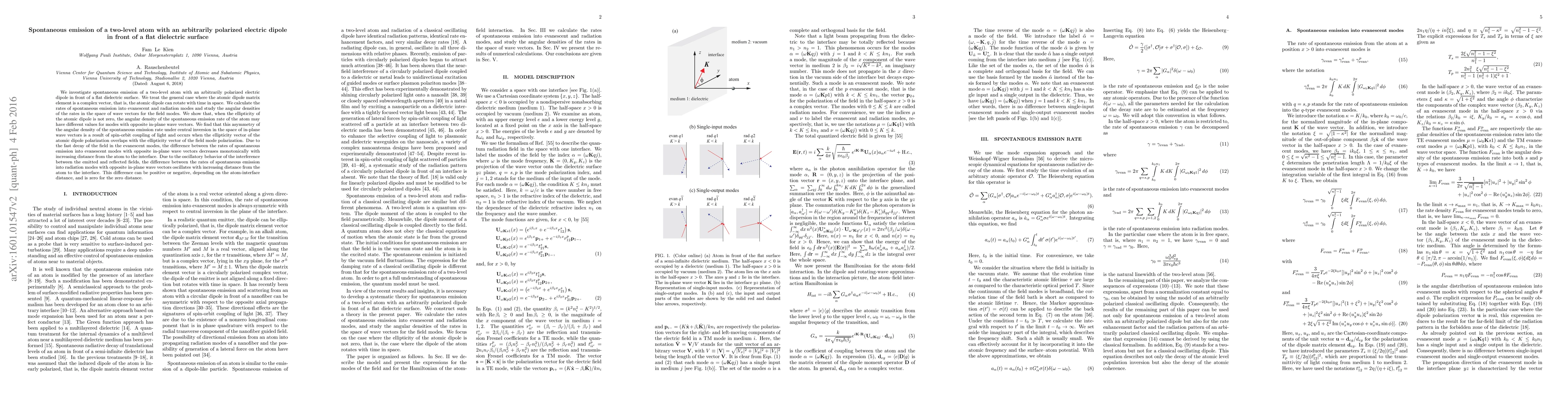 We investigate spontaneous emission of a two-level atom with an arbitrarily polarized electric dipole in front of a flat dielectric surface. We treat the general case where the atomic dipole matrix element is a complex vector, that is, the atomic dipole can rotate with time in space. We calculate the rates of spontaneous emission into evanescent and radiation modes and study the angular densities of the rates in the space of wave vectors for the field modes. We show that, when the ellipticity of the atomic dipole is not zero, the angular density of the spontaneous emission rate of the atom may have different values for modes with opposite in-plane wave vectors. We find that this asymmetry of the angular density of the spontaneous emission rate under central inversion in the space of in-plane wave vectors is a result of spin-orbit coupling of light and occurs when the ellipticity vector of the atomic dipole polarization overlaps with the ellipticity vector of the field mode polarization. Due to the fast decay of the field in the evanescent modes, the difference between the rates of spontaneous emission into evanescent modes with opposite in-plane wave vectors decreases monotonically with increasing distance from the atom to the interface. Due to the oscillatory behavior of the interference between the emitted and reflected fields, the difference between the rates of spontaneous emission into radiation modes with opposite in-plane wave vectors oscillates with increasing distance from the atom to the interface. This difference can be positive or negative, depending on the atom-interface distance, and is zero for the zero distance.