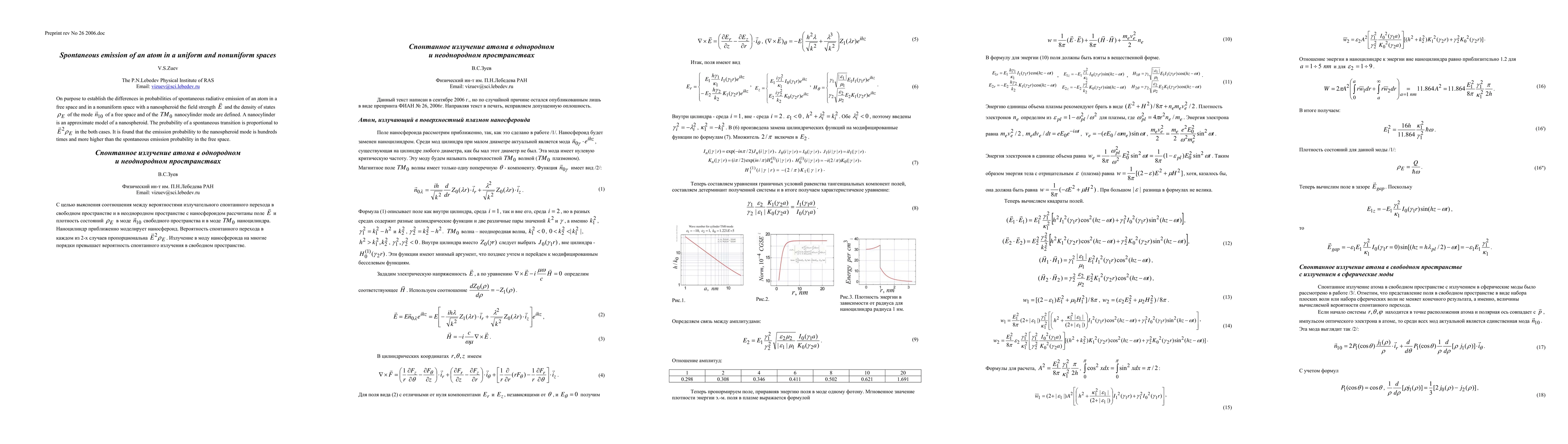 This paper investigates the differences in spontaneous emission probabilities of an atom in free space versus in a nonuniform space modeled by a nanocylinder. It finds that the emission probability to the nanocylinder mode is significantly higher than in free space, by hundreds of times.