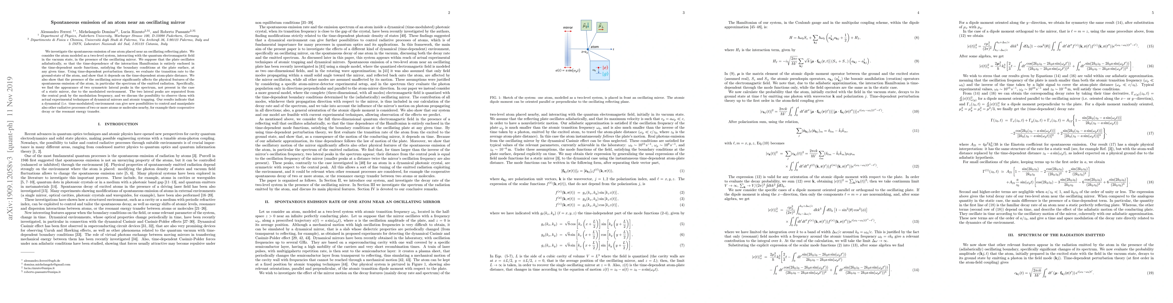 This research explores spontaneous emission of an atom near an oscillating mirror, using time-dependent perturbation theory. Key findings include a transition rate dependent on atom-plate distance and the appearance of two lateral peaks in the emission spectrum, distinct from a static mirror case, due to the modulated environment. The study suggests potential for controlling and manipulating radiative processes of multiple atoms or molecules in time-modulated environments.
