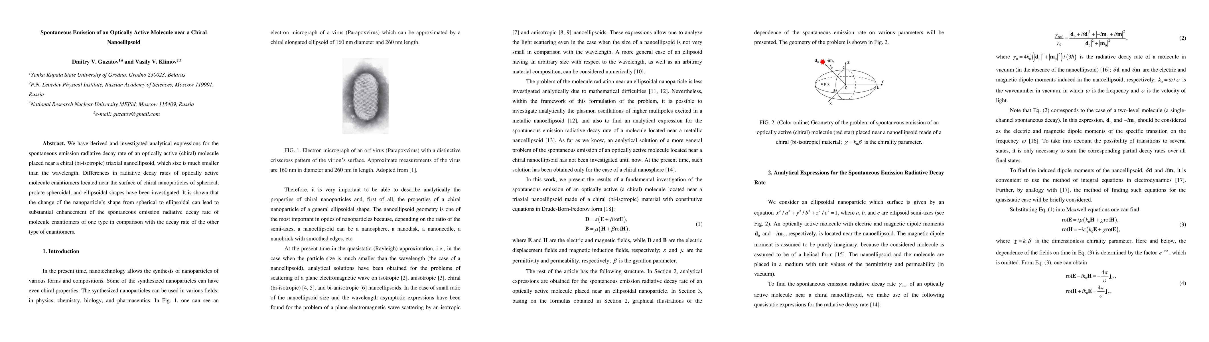 This paper derives analytical expressions for the spontaneous emission decay rate of chiral molecules near chiral nanoellipsoids, showing that the shape of the nanoparticle can significantly enhance the decay rate of one enantiomer over the other, depending on the nanoparticle's shape.