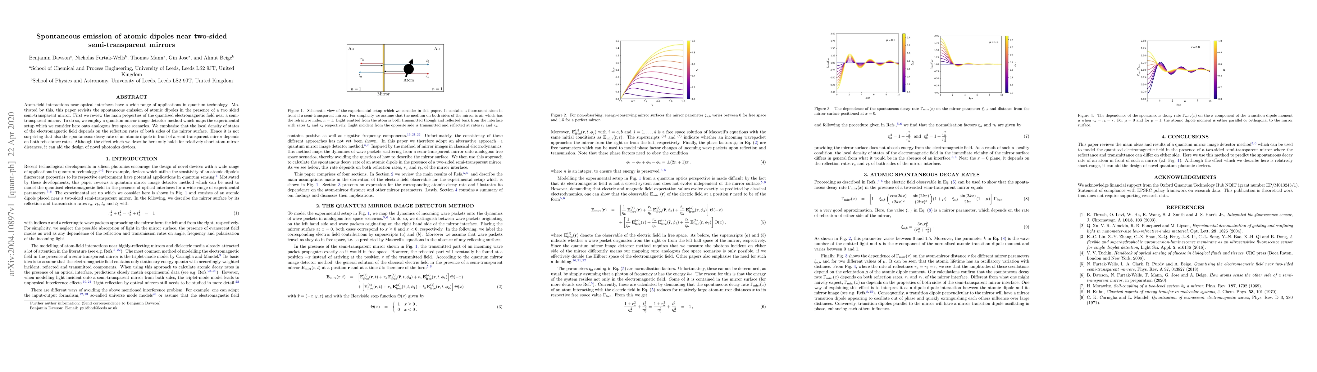 This paper examines the spontaneous emission of atomic dipoles in the vicinity of a two-sided semi-transparent mirror, revealing that the decay rate depends on the reflection rates of both sides. The study employs a quantum mirror image detector method to analyze the quantized electromagnetic field, highlighting potential applications in quantum technology and photonics.