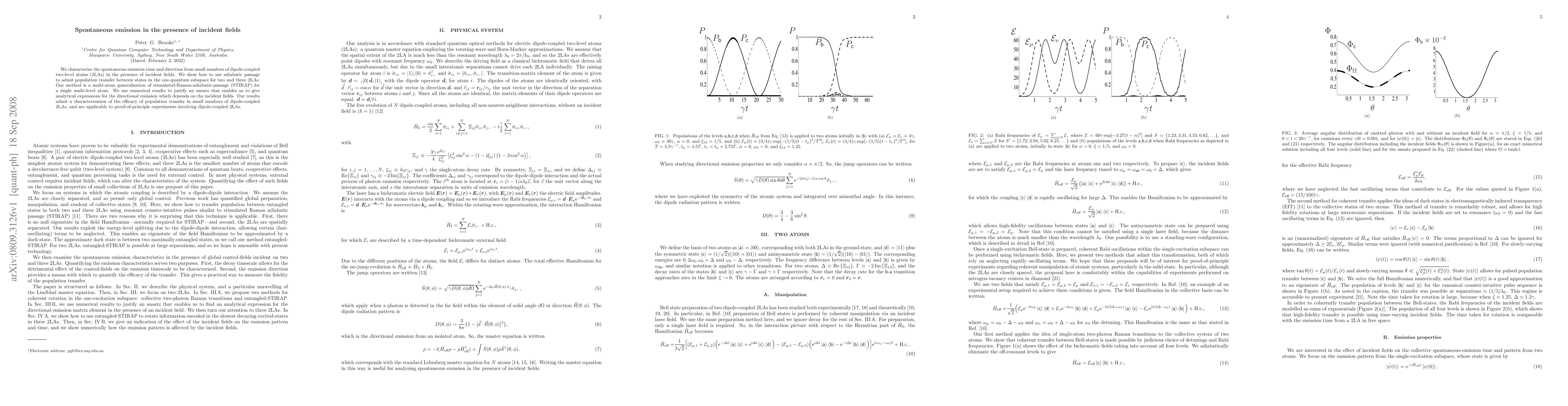 We characterise the spontaneous emission time and direction from small numbers of dipole-coupled two-level atoms (2LAs) in the presence of incident fields. We show how to use adiabatic passage to admit population transfer between states in the one-quantum subspace for two and three 2LAs. Our method is a multi-atom generalisation of stimulated-Raman-adiabatic-passage (STIRAP) for a single multi-level atom. We use numerical results to justify an ansatz that enables us to give analytical expressions for the directional emission which depends on the incident fields. Our results admit a characterisation of the efficacy of population transfer in small numbers of dipole-coupled 2LAs, and are applicable to proof-of-principle experiments involving dipole-coupled 2LAs.