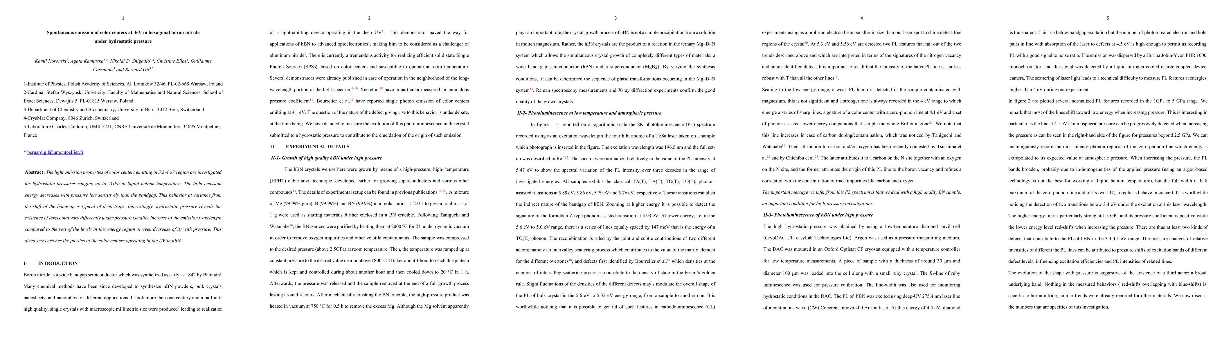 The light emission properties of color centers emitting in 3.3-4 eV region are investigated for hydrostatic pressures ranging up to 5GPa at liquid helium temperature. The light emission energy decreases with pressure less sensitively than the bandgap. This behavior at variance from the shift of the bandgap is typical of deep traps. Interestingly, hydrostatic pressure reveals the existence of levels that vary differently under pressure (smaller increase of the emission wavelength compared to the rest of the levels in this energy region or even decrease of it) with pressure. This discovery enriches the physics of the color centers operating in the UV in hBN.