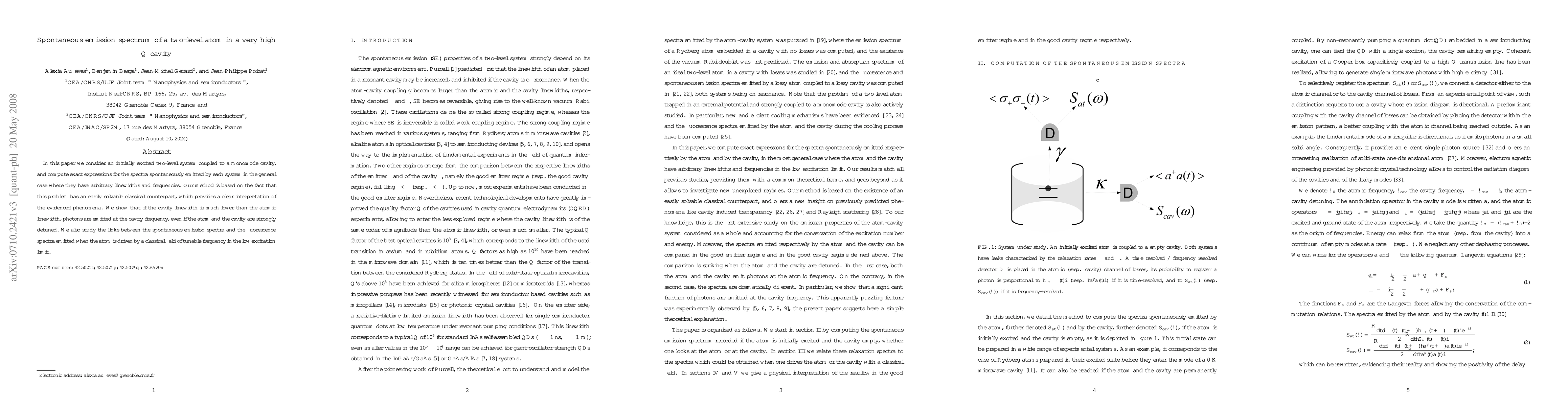In this paper we consider an initially excited two-level system coupled to a monomode cavity, and compute exact expressions for the spectra spontaneously emitted by each system in the general case where they have arbitrary linewidths and frequencies. Our method is based on the fact that this problem has an easily solvable classical counterpart, which provides a clear interpretation of the evidenced phenomena. We show that if the cavity linewidth is much lower than the atomic linewidth, photons are emitted at the cavity frequency, even if the atom and the cavity are strongly detuned. We also study the links between the spontaneous emission spectra and the fluorescence spectra emitted when the atom is driven by a classical field of tunable frequency.