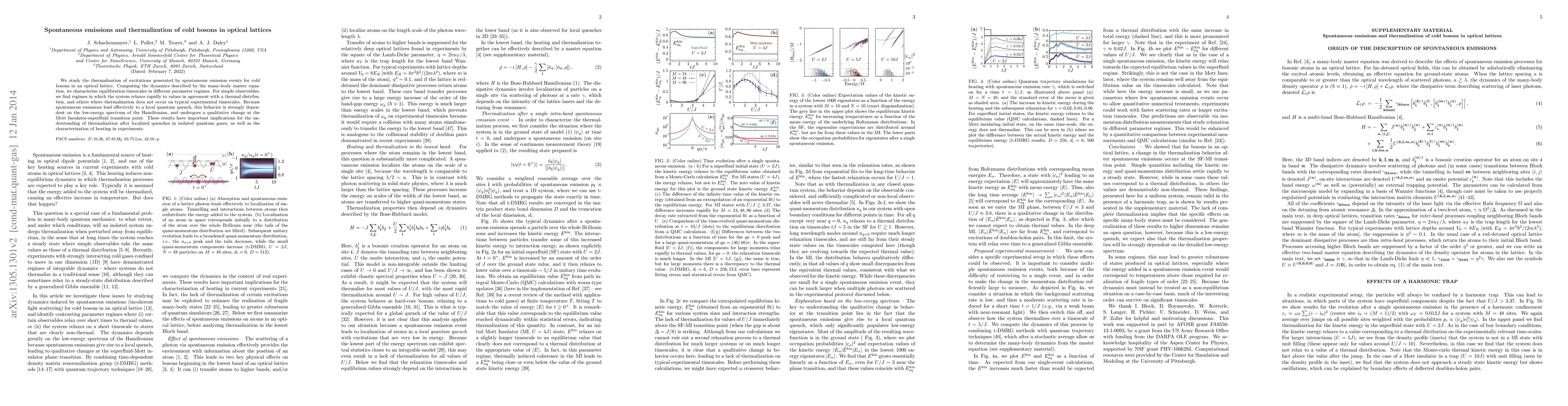 We study the thermalization of excitations generated by spontaneous emission events for cold bosons in an optical lattice. Computing the dynamics described by the many-body master equation, we characterize equilibration timescales in different parameter regimes. For simple observables, we find regimes in which the system relaxes rapidly to values in agreement with a thermal distribution, and others where thermalization does not occur on typical experimental timescales. Because spontaneous emissions lead effectively to a local quantum quench, this behavior is strongly dependent on the low-energy spectrum of the Hamiltonian, and undergoes a qualitative change at the Mott Insulator-superfluid transition point. These results have important implications for the understanding of thermalization after localized quenches in isolated quantum gases, as well as the characterization of heating in experiments.