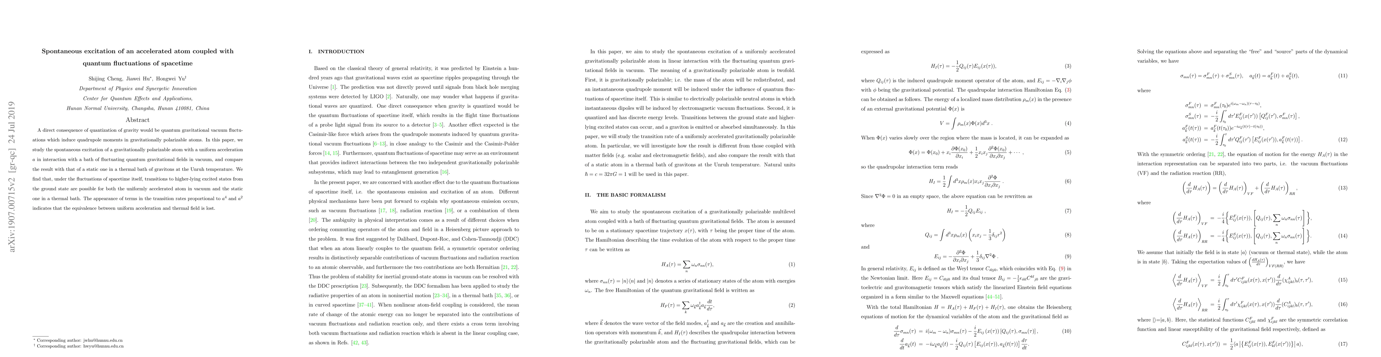 This paper investigates the spontaneous excitation of an accelerated atom interacting with quantum gravitational fluctuations, revealing that under these fluctuations, transitions to higher states occur, with transition rates proportional to $a^4$ and $a^2$, indicating a loss of equivalence between uniform acceleration and thermal fields.
