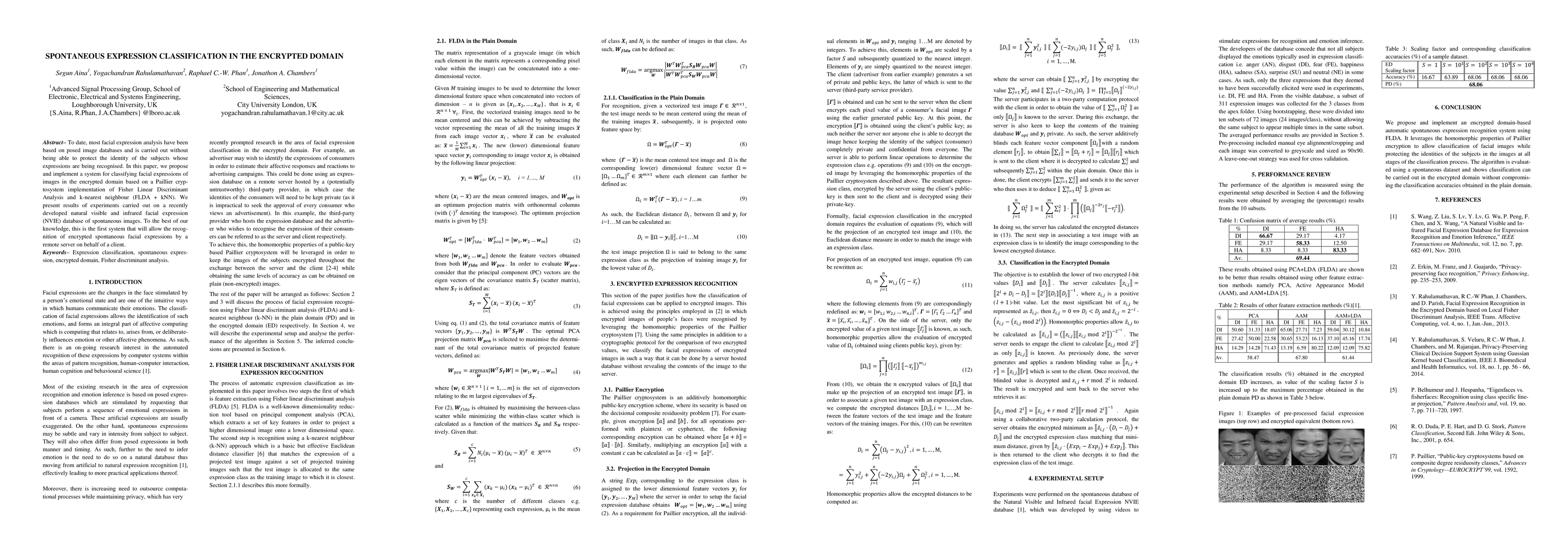 To date, most facial expression analysis have been based on posed image databases and is carried out without being able to protect the identity of the subjects whose expressions are being recognised. In this paper, we propose and implement a system for classifying facial expressions of images in the encrypted domain based on a Paillier cryptosystem implementation of Fisher Linear Discriminant Analysis and k-nearest neighbour (FLDA + kNN). We present results of experiments carried out on a recently developed natural visible and infrared facial expression (NVIE) database of spontaneous images. To the best of our knowledge, this is the first system that will allow the recog-nition of encrypted spontaneous facial expressions by a remote server on behalf of a client.