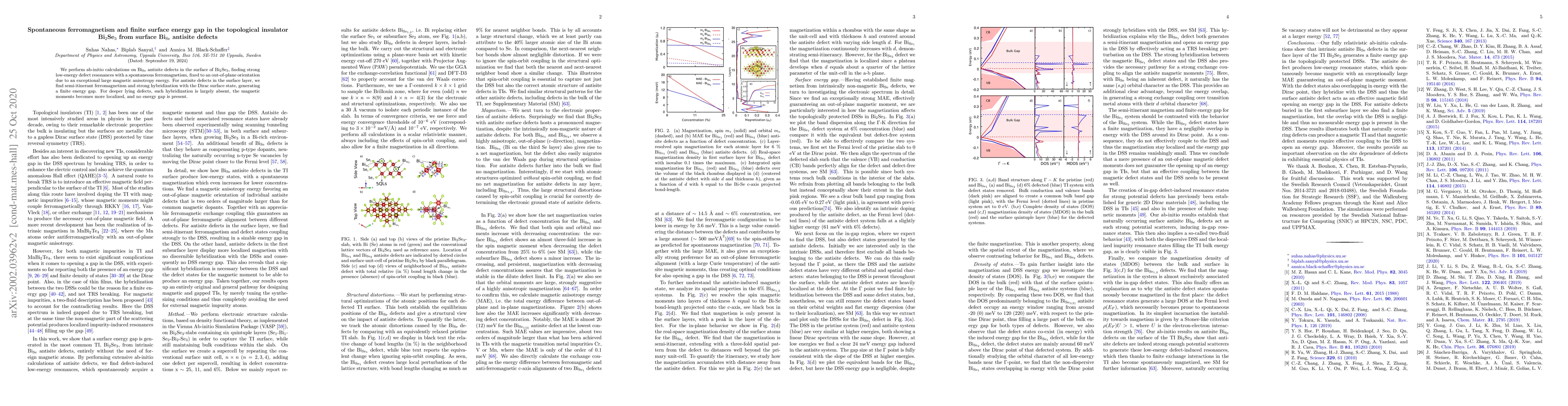 Researchers found that antisite defects in the surface of topological insulator Bi$_2$Se$_3$ lead to spontaneous ferromagnetism and a finite energy gap due to hybridization with the Dirac surface state, depending on defect depth.