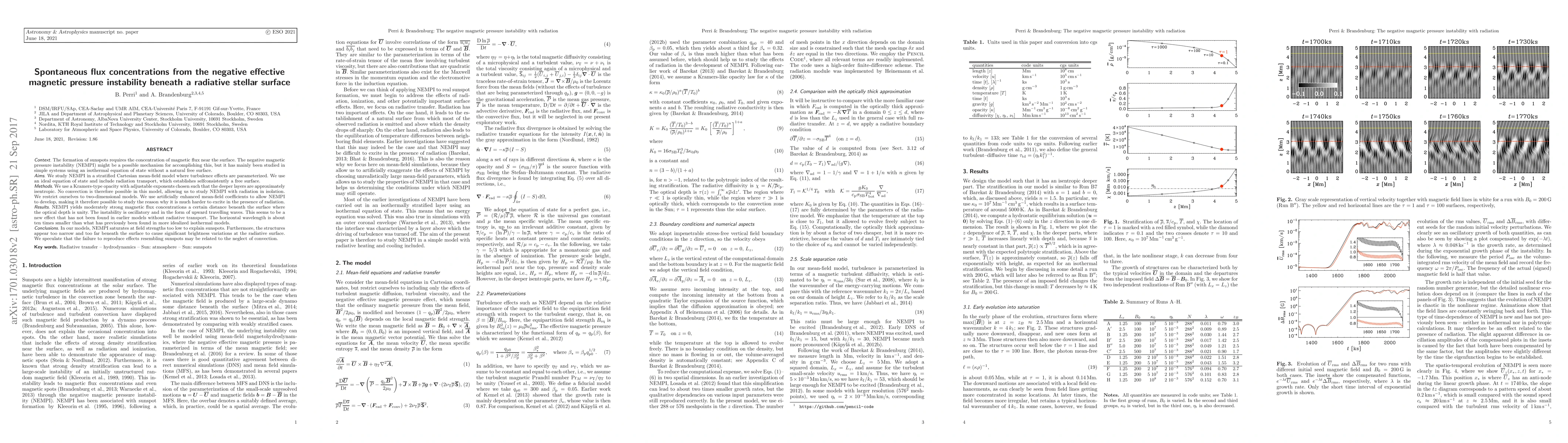 The formation of sunspots requires the concentration of magnetic flux near the surface. The negative magnetic pressure instability (NEMPI) might be a possible mechanism for accomplishing this, but it has mainly been studied in simple systems using an isothermal equation of state without a natural free surface. We study NEMPI in a stratified Cartesian mean-field model where turbulence effects are parameterized. We use an ideal equation of state and include radiation transport, which establishes selfconsistently a free surface. We use a Kramers-type opacity with adjustable exponents chosen such that the deeper layers are approximately isentropic. No convection is therefore possible in this model, allowing us to study NEMPI with radiation in isolation. We restrict ourselves to two-dimensional models. We use artificially enhanced mean-field coefficients to allow NEMPI to develop, making it therefore possible to study the reason why it is much harder to excite in the presence of radiation. NEMPI yields moderately strong magnetic flux concentrations a certain distance beneath the surface where optical depth is unity. The instability is oscillatory and in the form of upward travelling waves. This seems to be a new effect that has not been found in earlier models without radiative transport. The horizontal wavelength is about ten times smaller than what has been found previously in more idealized isothermal models. In our models, NEMPI saturates at field strengths too low to explain sunspots. Furthermore, the structures appear too narrow and too far beneath the surface to cause significant brightness variations at the radiative surface. We speculate that the failure to reproduce effects resembling sunspots may be related to the neglect of convection.