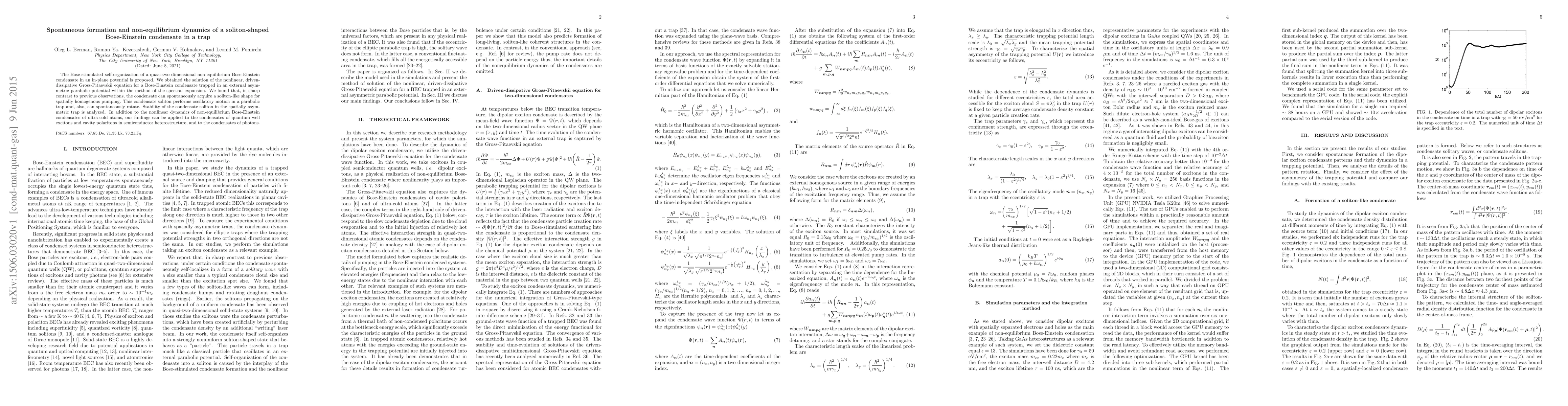 This paper investigates the spontaneous formation of a soliton-shaped Bose-Einstein condensate in a non-equilibrium state, revealing its oscillatory and rotational dynamics within an asymmetric trap. The study employs the spectral expansion method to solve the driven-dissipative Gross-Pitaevskii equation, demonstrating the condensate's stability and potential applications to various quantum systems.