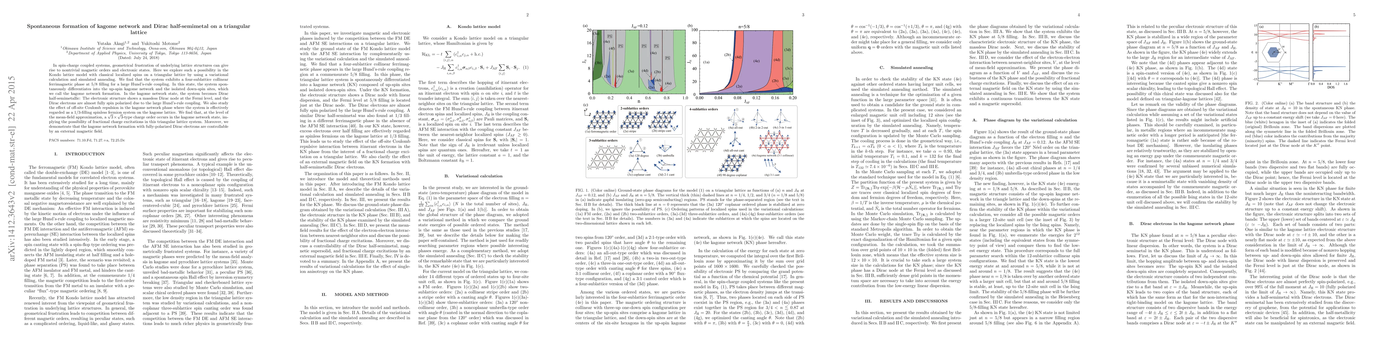 This research explores a Kondo lattice model on a triangular lattice, revealing a spontaneous formation of a kagome network and a Dirac half-semimetal state characterized by a massless Dirac node at the Fermi level. The study also investigates the effects of off-site Coulomb repulsion and external magnetic fields on this system.