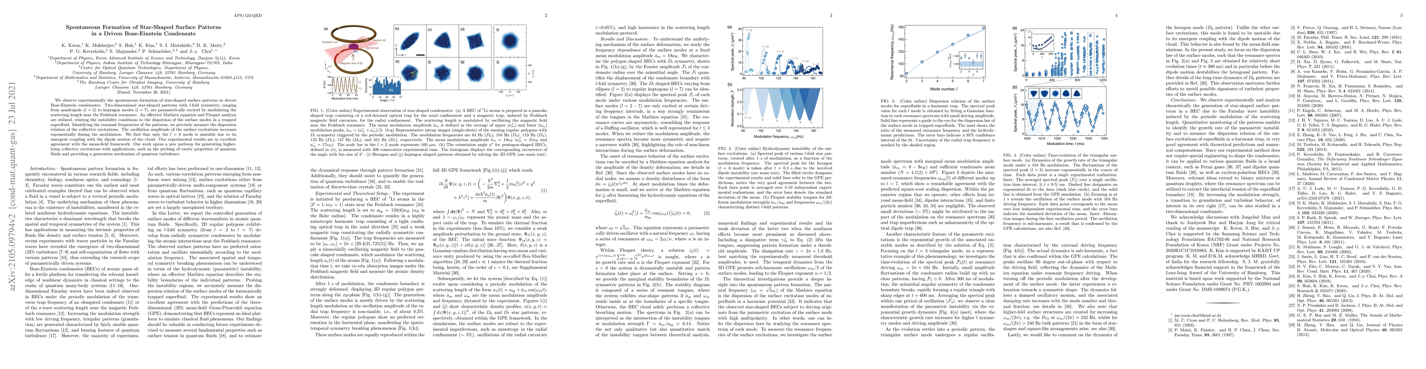 We observe experimentally the spontaneous formation of star-shaped surface patterns in driven Bose-Einstein condensates. Two-dimensional star-shaped patterns with $l$-fold symmetry, ranging from quadrupole ($l=2$) to heptagon modes ($l=7$), are parametrically excited by modulating the scattering length near the Feshbach resonance. An effective Mathieu equation and Floquet analysis are utilized, relating the instability conditions to the dispersion of the surface modes in a trapped superfluid. Identifying the resonant frequencies of the patterns, we precisely measure the dispersion relation of the collective excitations. The oscillation amplitude of the surface excitations increases exponentially during the modulation. We find that only the $l=6$ mode is unstable due to its emergent coupling with the dipole motion of the cloud. Our experimental results are in excellent agreement with the mean-field framework. Our work opens a new pathway for generating higher-lying collective excitations with applications, such as the probing of exotic properties of quantum fluids and providing a generation mechanism of quantum turbulence.