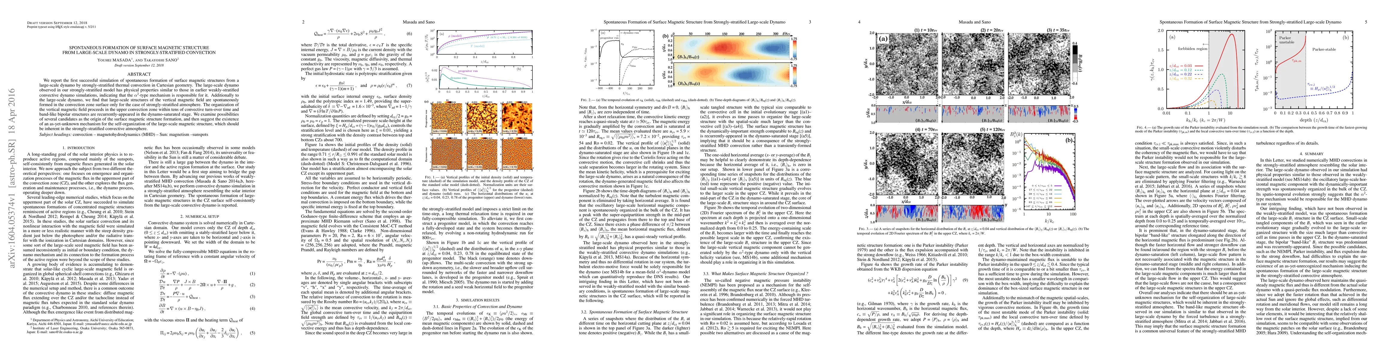 This research paper reports the first simulation of surface magnetic structures spontaneously forming from a large-scale dynamo driven by strongly-stratified thermal convection. The study suggests a novel mechanism for the self-organization of large-scale magnetic structures in strongly-stratified atmospheres, distinct from the $\alpha^2$-type mechanism seen in weakly-stratified models.