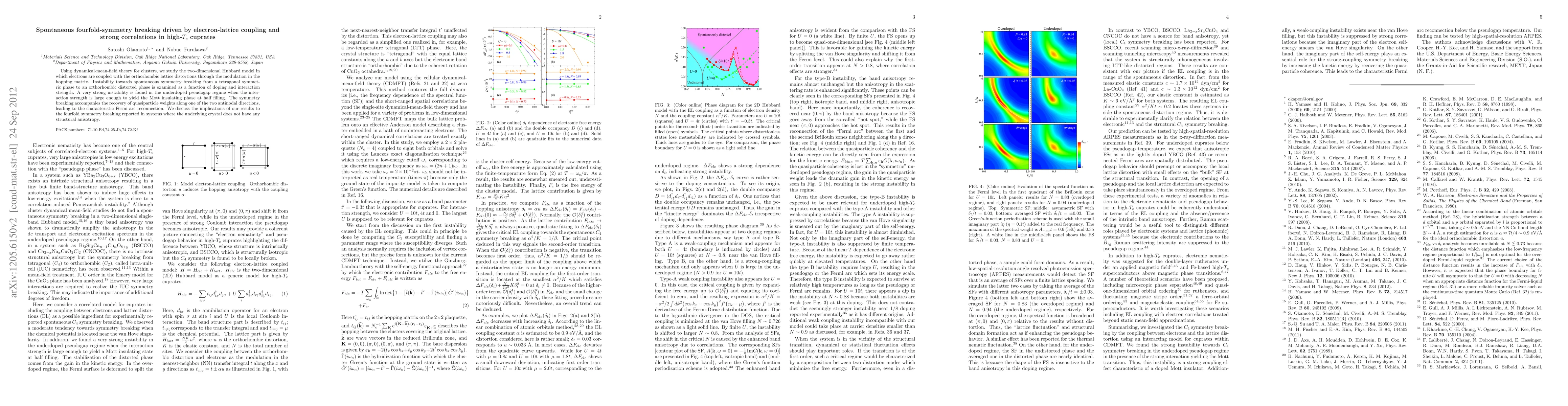 Using dynamical-mean-field theory for clusters, we study the two-dimensional Hubbard model in which electrons are coupled with the orthorhombic lattice distortions through the modulation in the hopping matrix. Instability towards spontaneous symmetry breaking from a tetragonal symmetric phase to an orthorhombic distorted phase is examined as a function of doping and interaction strength. A very strong instability is found in the underdoped pseudogap regime when the interaction strength is large enough to yield the Mott insulating phase at half filling. The symmetry breaking accompanies the recovery of quasiparticle weights along one of the two antinodal directions, leading to the characteristic Fermi arc reconnection. We discuss the implications of our results to the fourfold symmetry breaking reported in systems where the underlying crystal does not have any structural anisotropy.