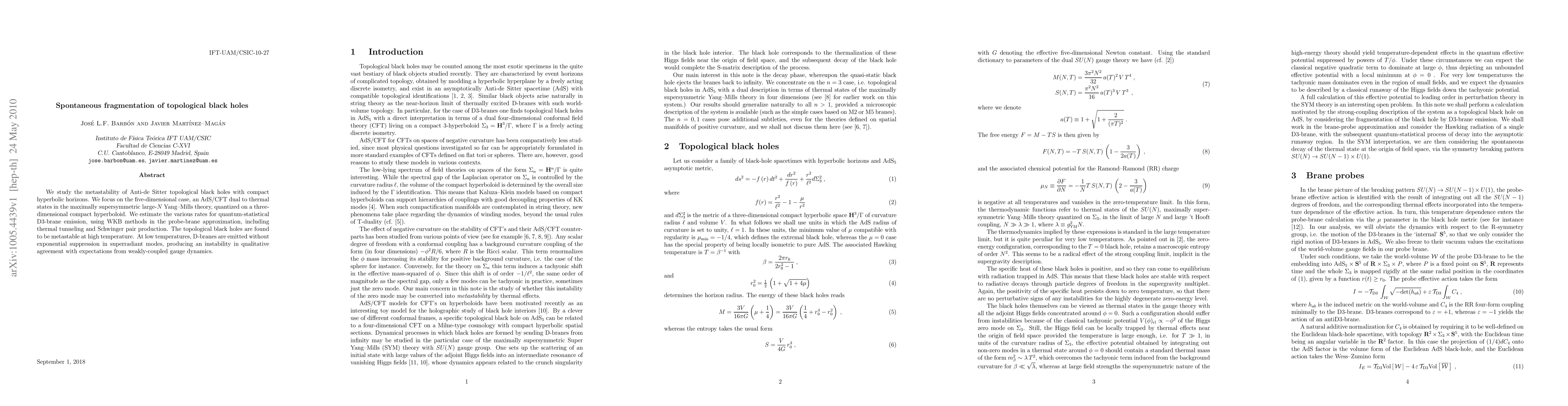 We study the metastability of Anti-de Sitter topological black holes with compact hyperbolic horizons. We focus on the five-dimensional case, an AdS/CFT dual to thermal states in the maximally supersymmetric large-N Yang-Mills theory, quantized on a three-dimensional compact hyperboloid. We estimate the various rates for quantum-statistical D3-brane emission, using WKB methods in the probe-brane approximation, including thermal tunneling and Schwinger pair production. The topological black holes are found to be metastable at high temperature. At low temperatures, D-branes are emitted without exponential suppression in superradiant modes, producing an instability in qualitative agreement with expectations from weakly-coupled gauge dynamics.