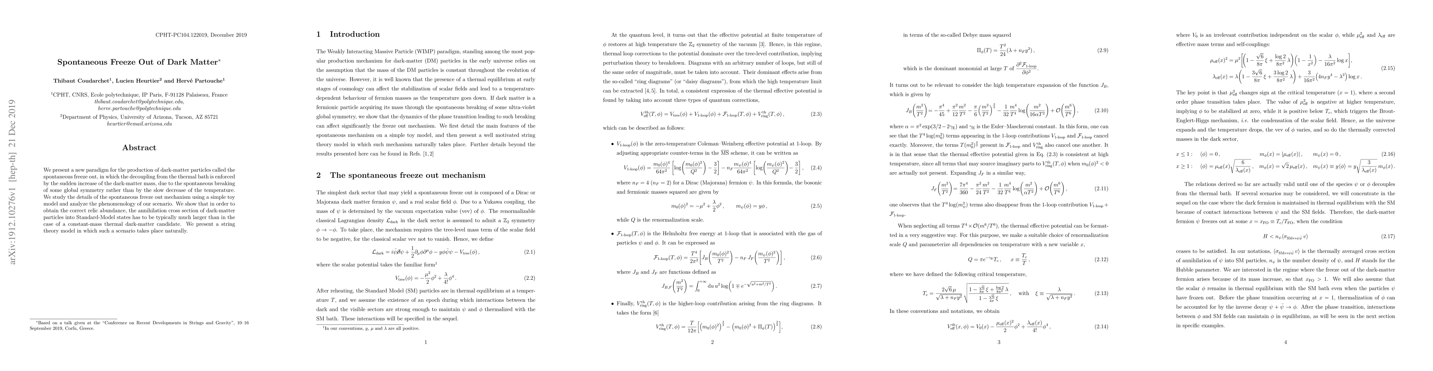 This paper introduces a novel dark matter production mechanism termed "spontaneous freeze out," where dark matter decoupling occurs due to a sudden increase in mass from symmetry breaking, rather than temperature reduction. The study finds that this scenario requires a significantly larger annihilation cross-section compared to traditional thermal dark matter models, and presents a string theory model that naturally accommodates this scenario.