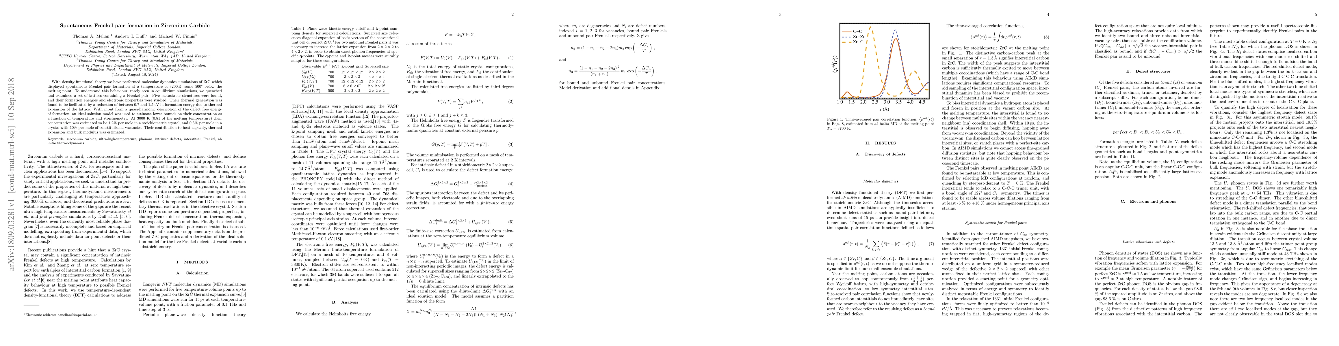 With density functional theory we have performed molecular dynamics simulations of ZrC which displayed spontaneous Frenkel pair formation at a temperature of 3200 K, some 500 K below the melting point. To understand this behaviour, rarely seen in equilibrium simulations, we quenched and examined a set of lattices containing a Frenkel pair. Five metastable structures were found, and their formation energies and electronic properties were studied. Their thermal generation was found to be facilitated by a reduction of between 0.7 and 1.5 eV in formation energy due to thermal expansion of the lattice. With input from a quasi-harmonic description of the defect free energy of formation, an ideal solution model was used to estimate lower bounds on their concentration as a function of temperature and stoichiometry. At 3000 K (0.81 of the melting temperature) their concentration was estimated to be 1.2% per mole in a stoichiometric crystal, and 0.3% per mole in a crystal with 10% per mole of constitutional vacancies. Their contribution to heat capacity, thermal expansion and bulk modulus was estimated.