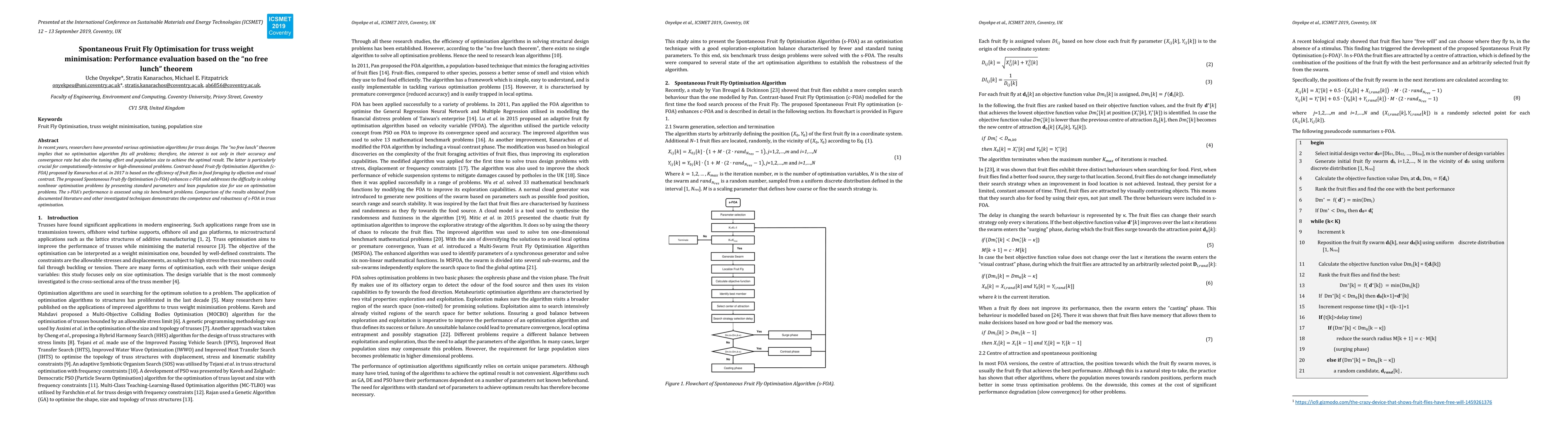 This paper proposes the Spontaneous Fruit Fly Optimisation (s-FOA) algorithm to enhance truss weight minimisation, evaluating its performance against the no free lunch theorem. The study demonstrates s-FOA's competence and robustness through comparisons with other techniques on six benchmark problems.