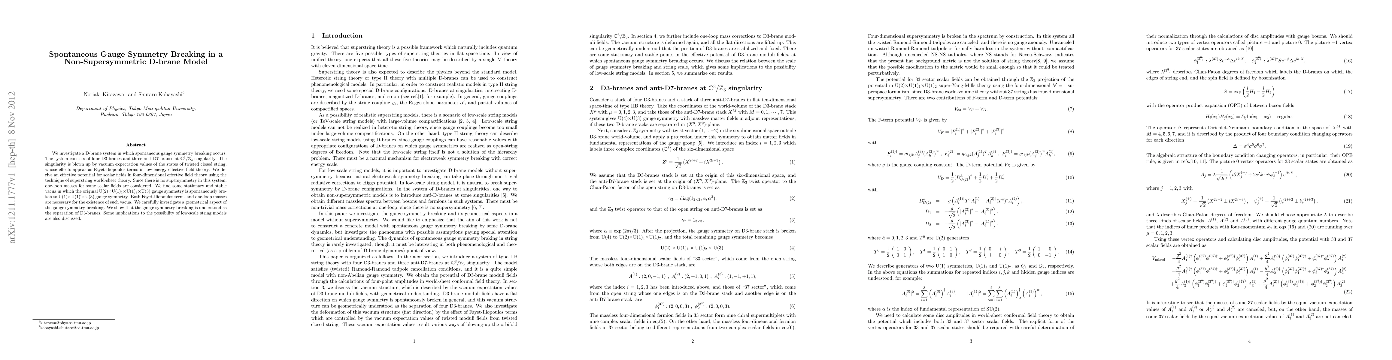 This paper explores a D-brane system with spontaneous gauge symmetry breaking in a non-supersymmetric context, revealing stable vacua through the separation of D3-branes and the influence of Fayet-Iliopoulos terms and one-loop masses. The model's implications for low-scale string theories are also examined.