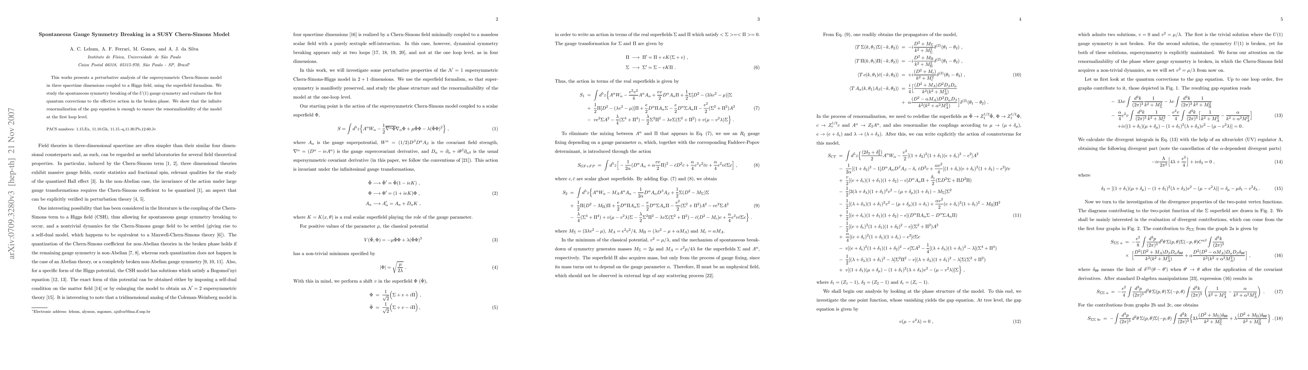 This paper analyzes the supersymmetric Chern-Simons model in three dimensions, demonstrating spontaneous gauge symmetry breaking and evaluating quantum corrections. It concludes that the model remains renormalizable at the first loop level due to infinite renormalization of the gap equation.