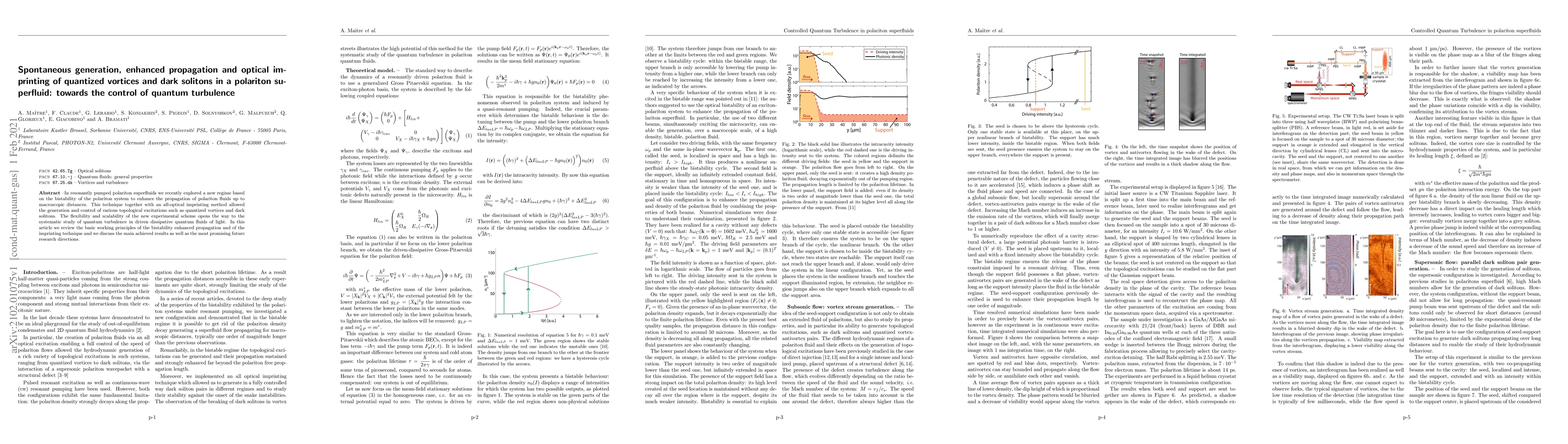 This paper reviews the enhanced propagation and optical imprinting of quantized vortices and dark solitons in polariton superfluids, highlighting the potential for controlling quantum turbulence through a new experimental scheme based on bistability and macroscopic distance propagation. Future research directions are also discussed.